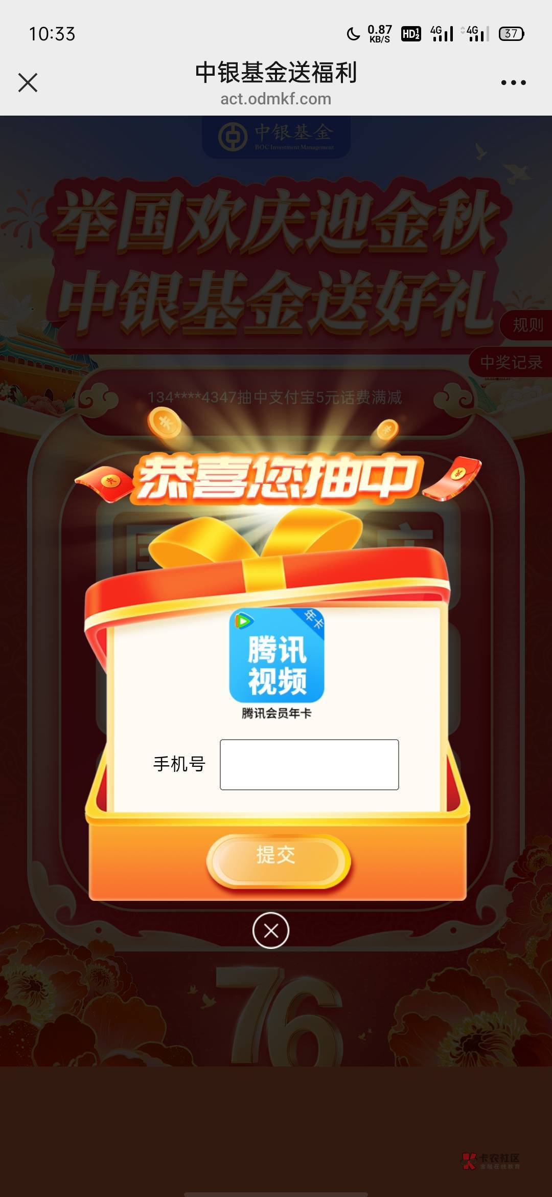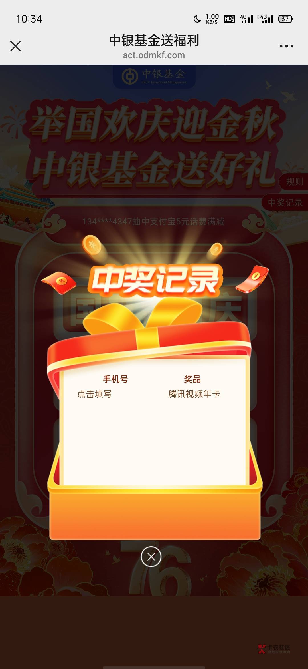 你百度搜中银基金在线客服问下,把中奖截图发给他