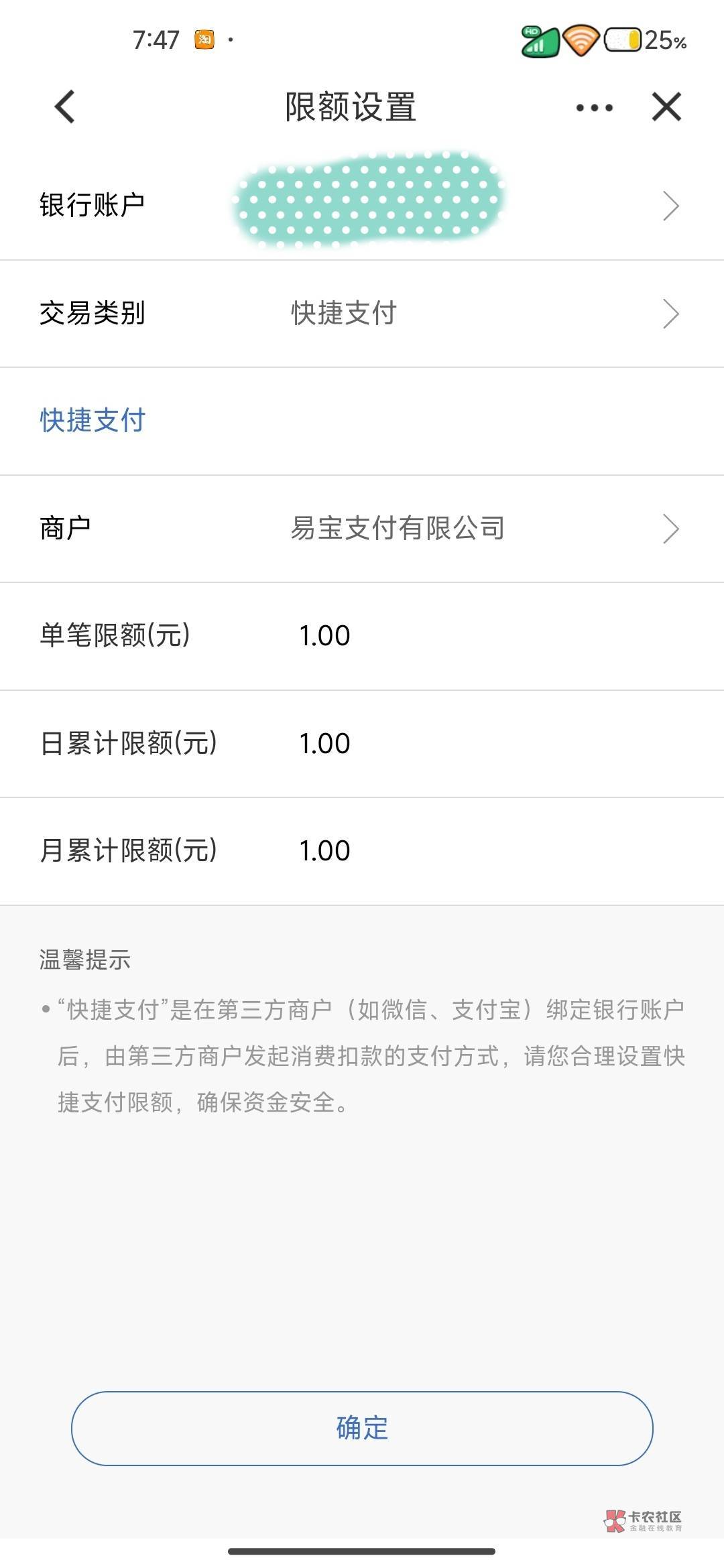 关键这不是跨行支付的是快捷支付里面的那个不可以设置扣款额度