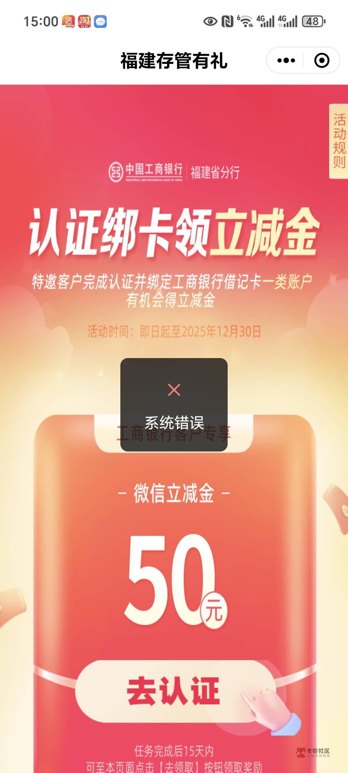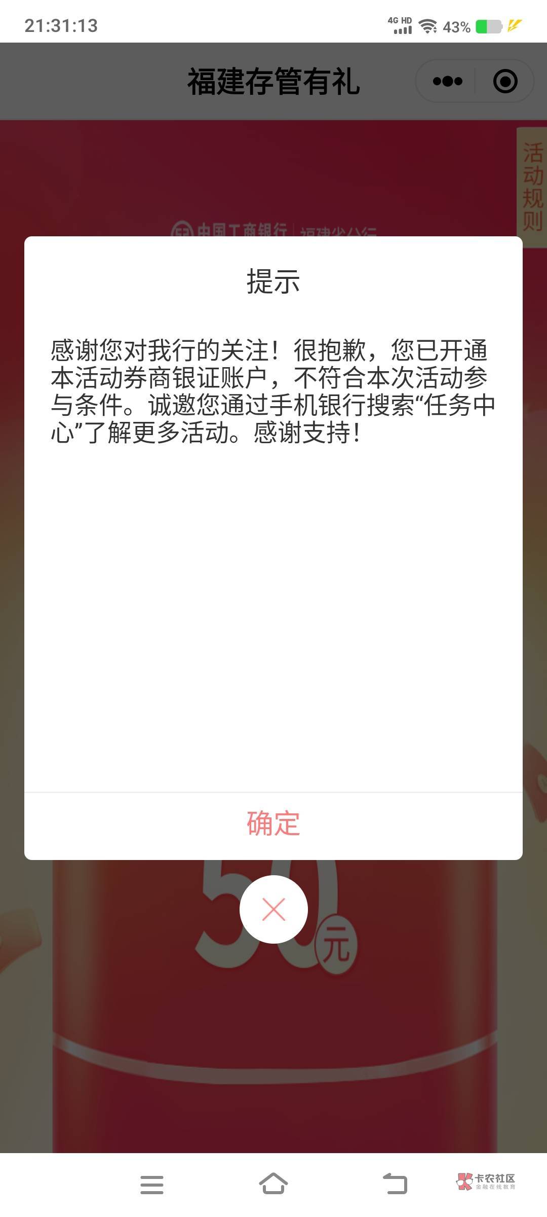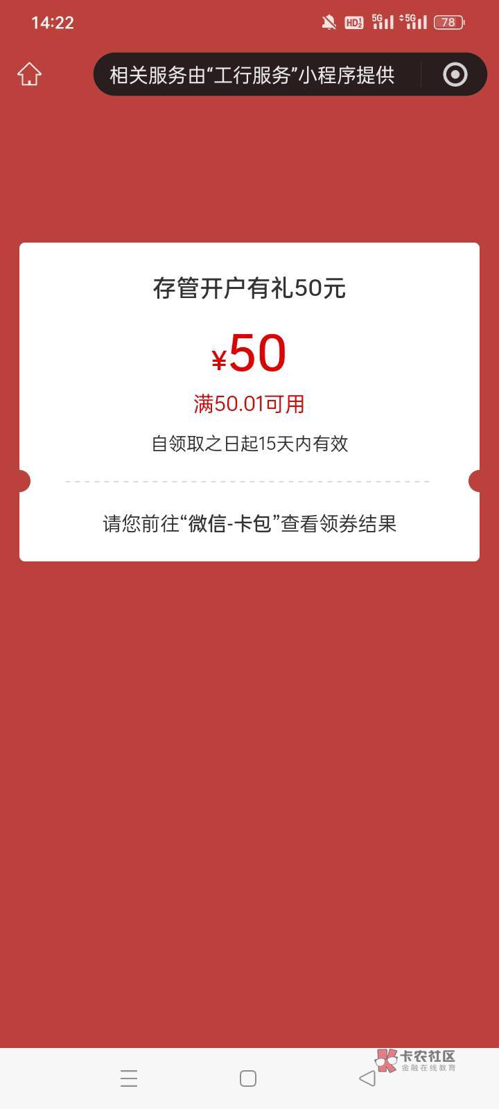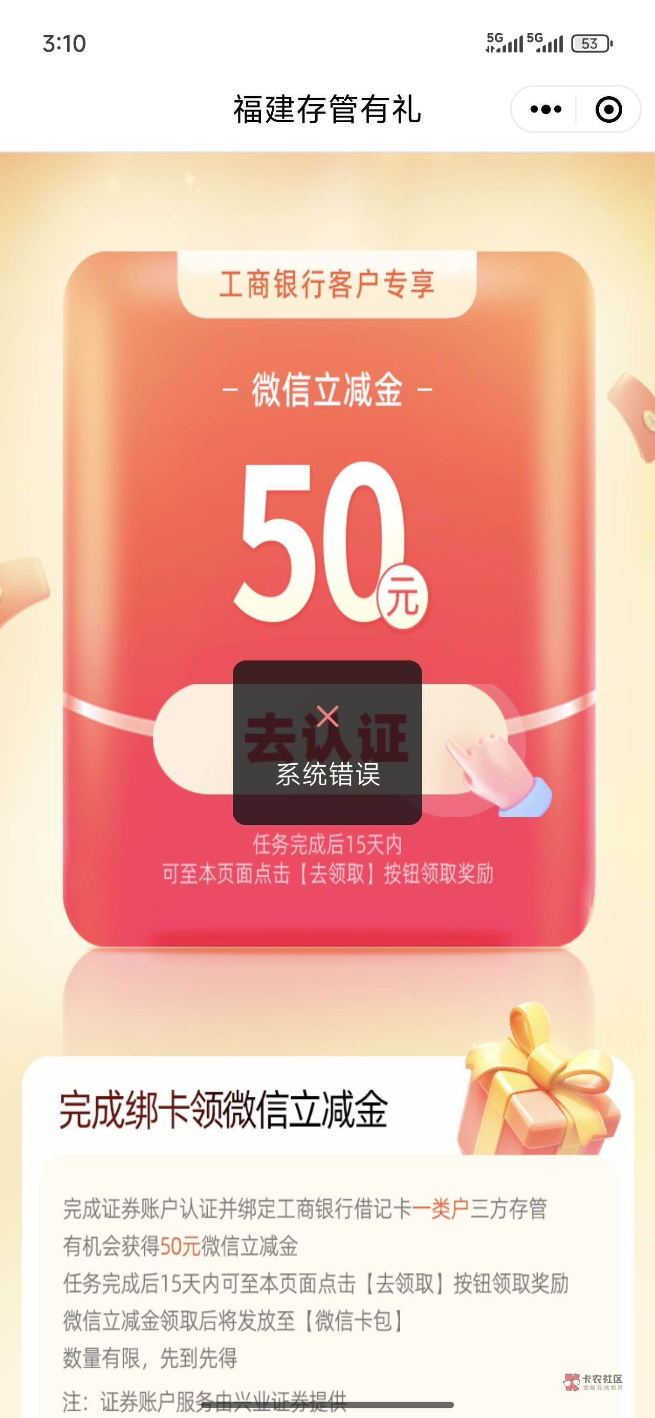 微应用里面福建三方存管点进去,上面就写着50,我的是这样子的,然后我就开了.证券,开户完回来就可以领了,全程没有超过十分钟