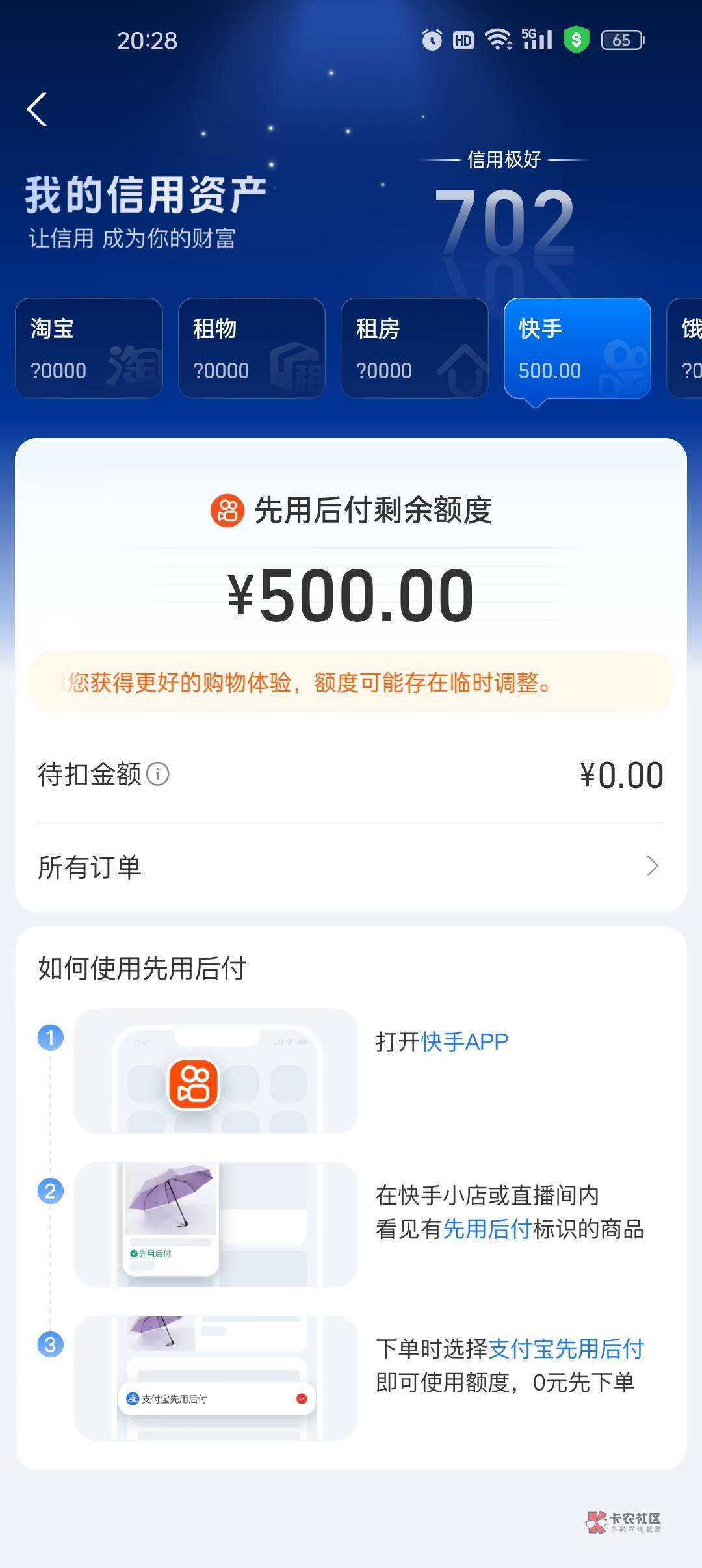 用不了,直接是只看不让用,快手就只有微信先用后付就没有支付宝通道,