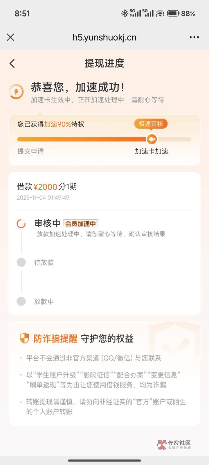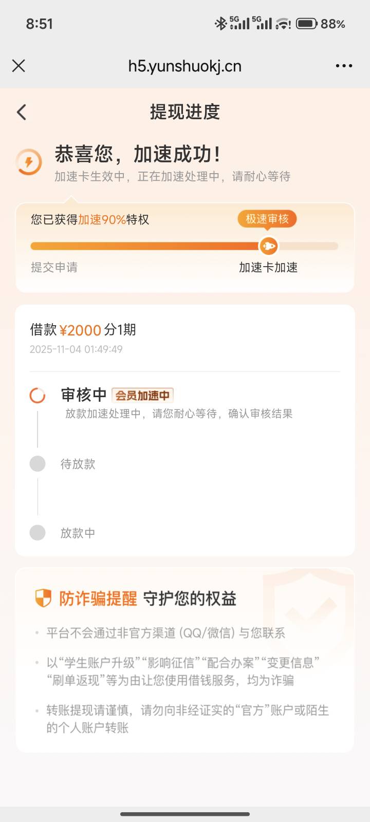 昨天申请今天到的?下午点了给了三千,分两期,还在审核,不知道能不能到