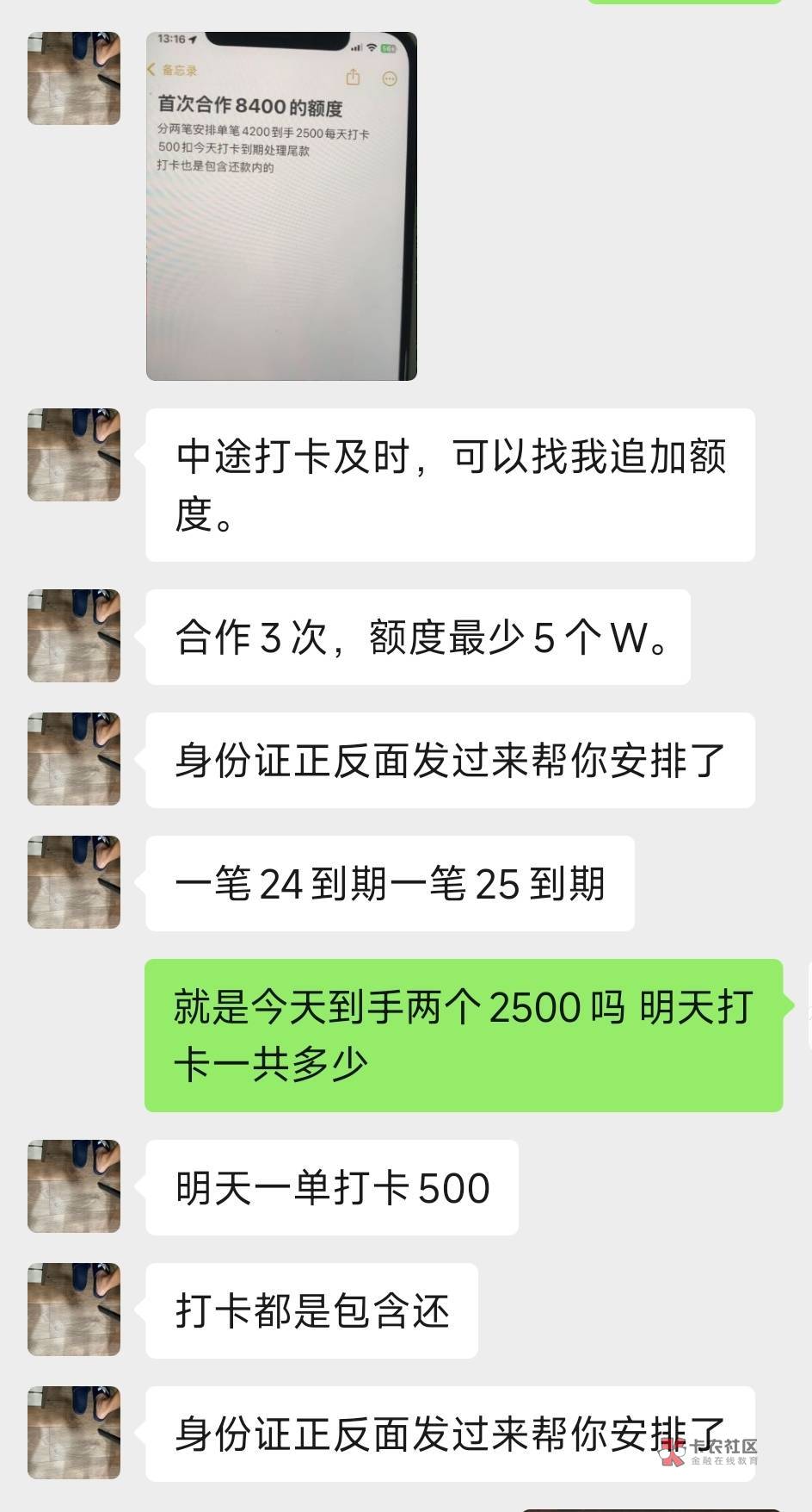 跟我想法一样 今天两个财务加我了 明天打卡500,后面的一期申请了