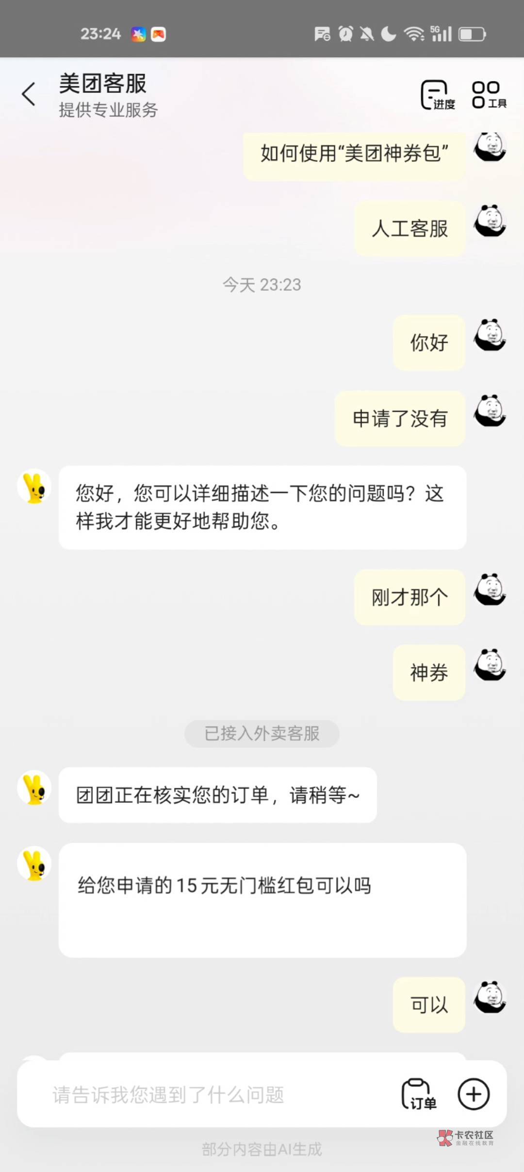 拿图找工客服,说刚刚申请的15元无门槛没到账