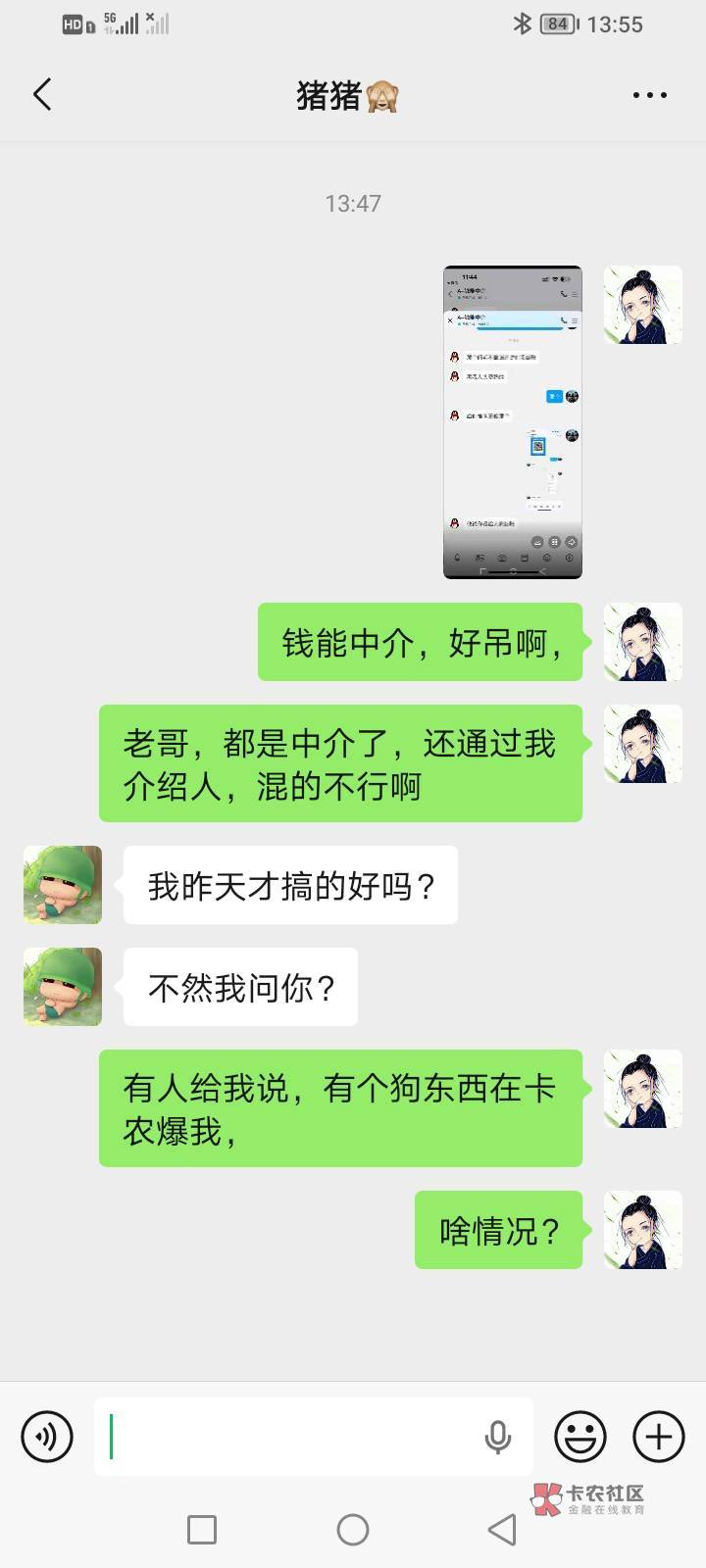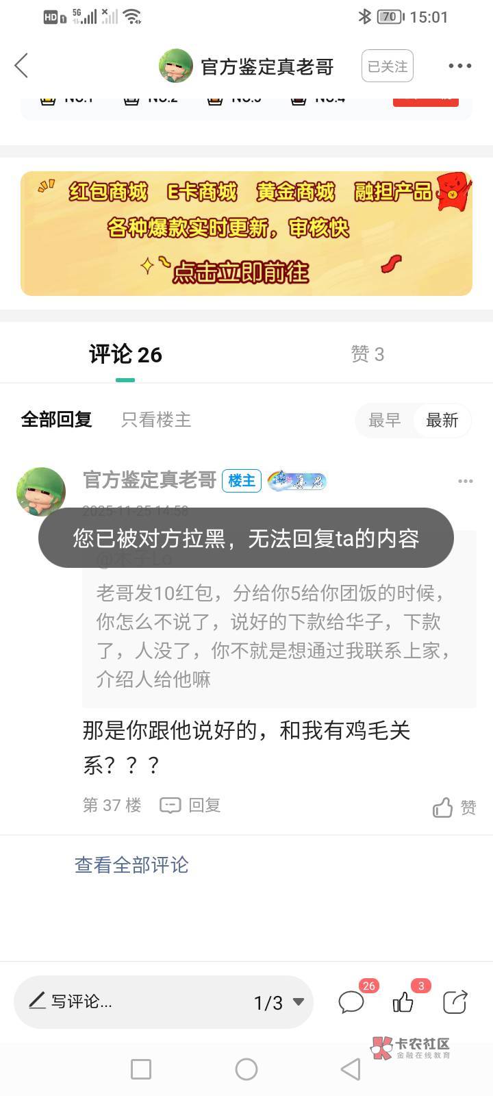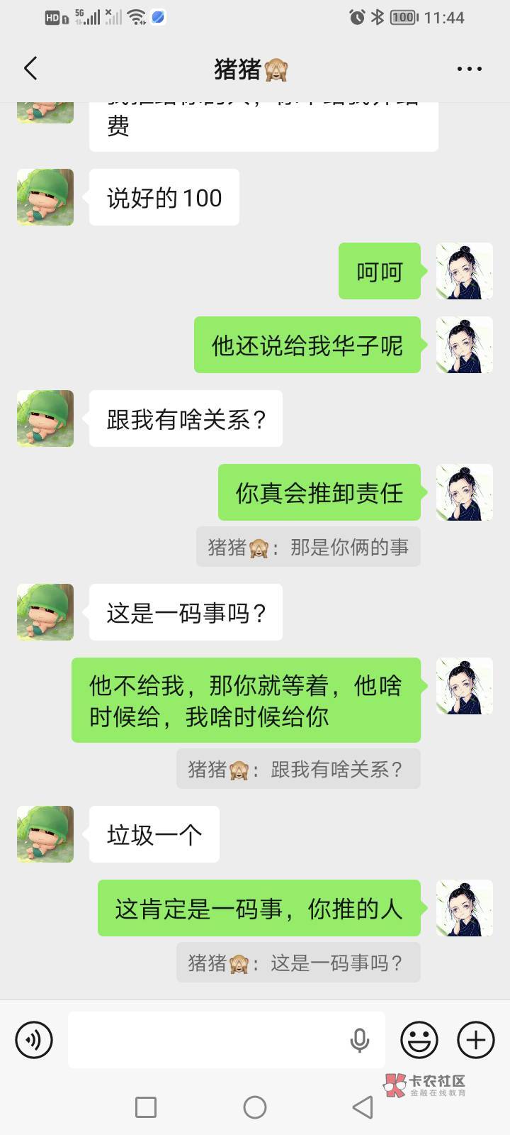 你看他帖子,我没说不给,我说他把红包给我,我立马给你,我给那个人发消息不回,他两一直在聊天,他两就是串通好的,通过我联系上家,现在好了,当中介了