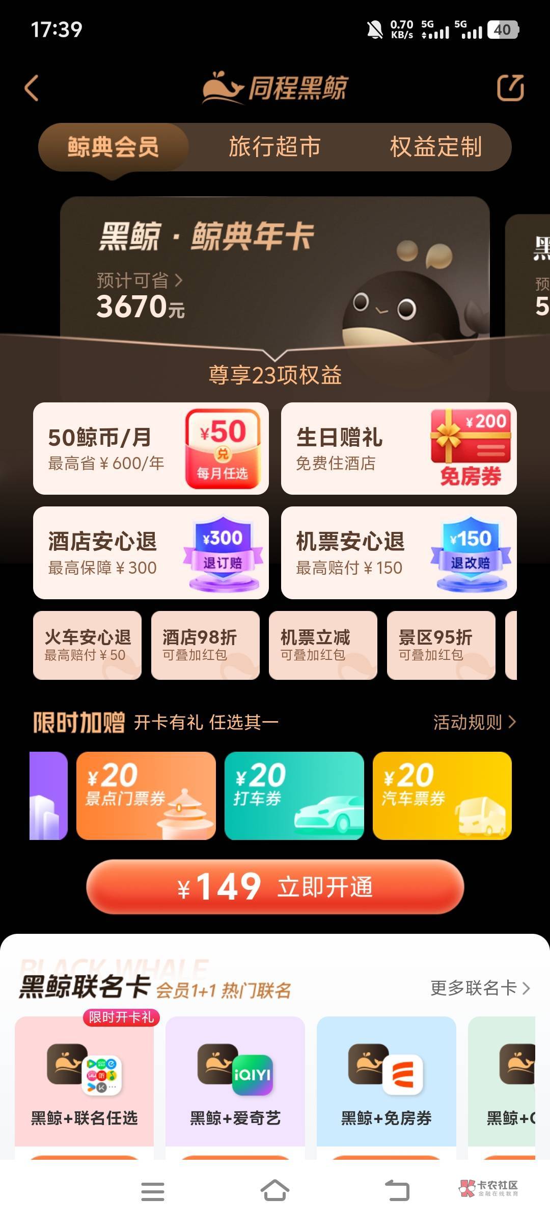 下面那个联名卡才可以,黑鲸加免房券那个