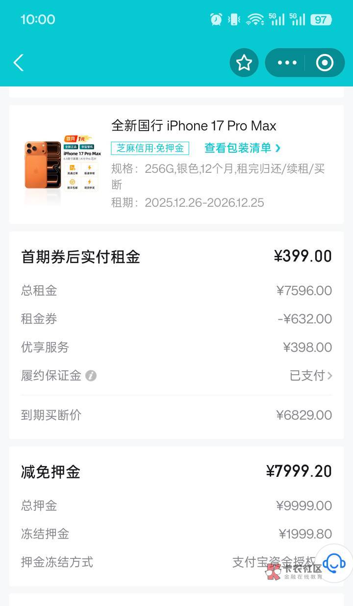 【探物】尊敬用户,您好!您通过支付宝在探物租赁下单的全新国行 iPhone 17 Pro Max产品已通过审核,该产品月租金为633.00元,12期总租金为6964.00元,账单到期日为每月26号,请您按时通过支付宝支付租金,避免未及时支付影响您的信用。