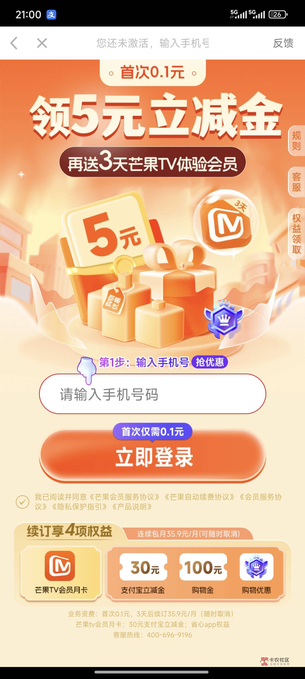五个鸡毛,这个给的是话费充值券,而且也不是五是三,还特么不能手动取消自动续费