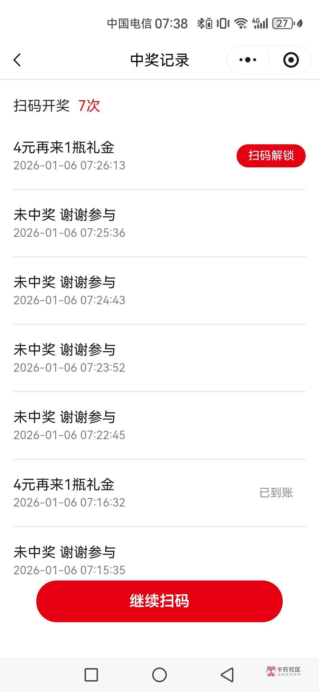 跟我一样,有一个第六次中4扫没反应,有一个第7次扫描没反应。