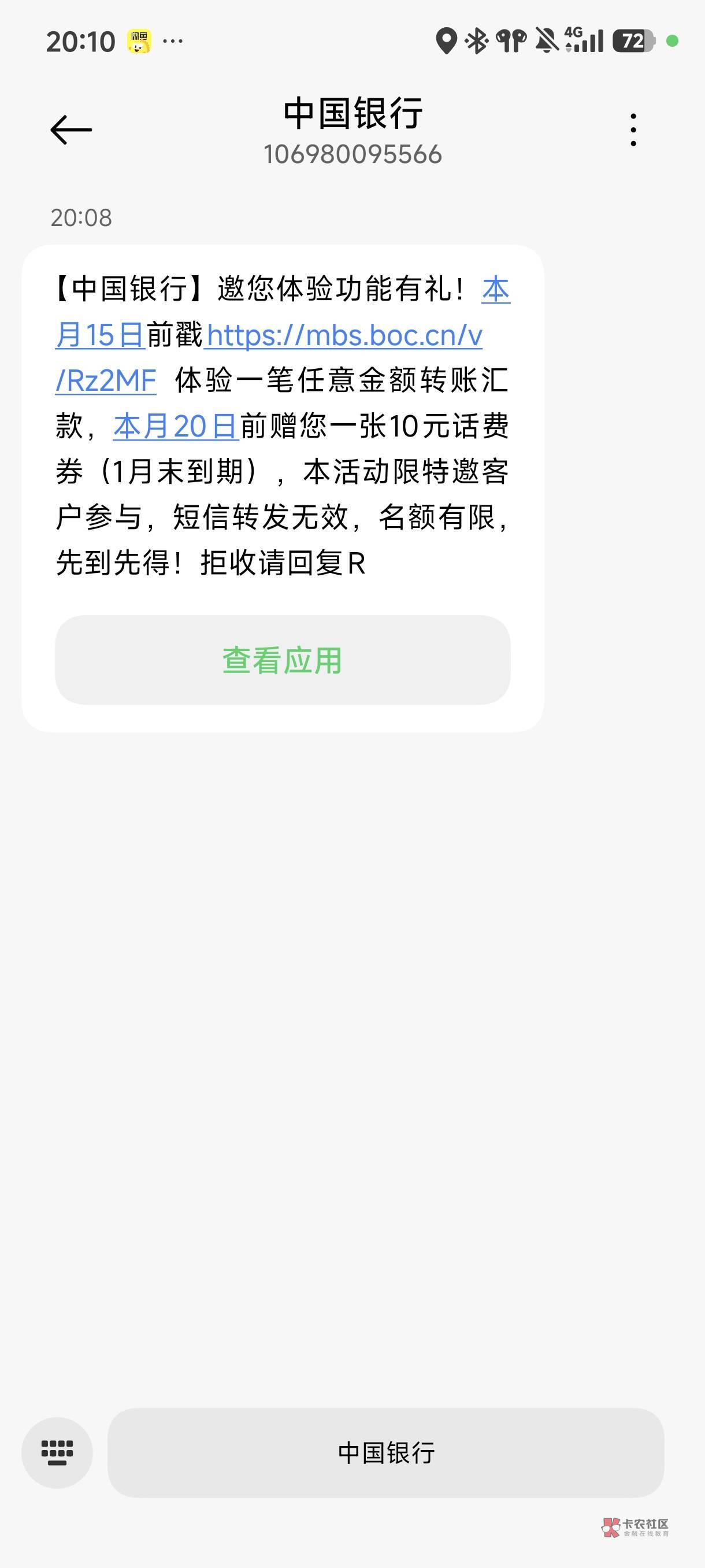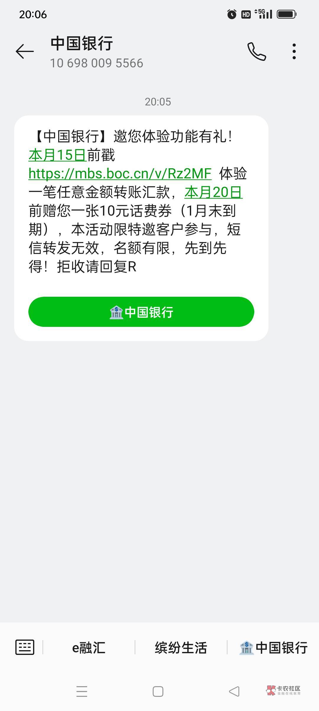 【中国银行】邀您体验功能有礼!本月15日前戳https://mbs.boc.cn/v/Rz2MF 体验一笔任意金额转账汇款,本月20日前赠您一张10元话费券(1月末到期),本活动限特邀客户参与,短信转发无效,名额有限,先到先得!拒收请回复R