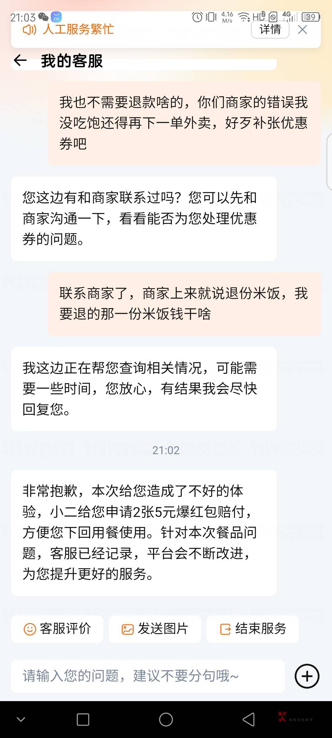 我在小饿点的外卖都是苦的就这小饿都不给我退款