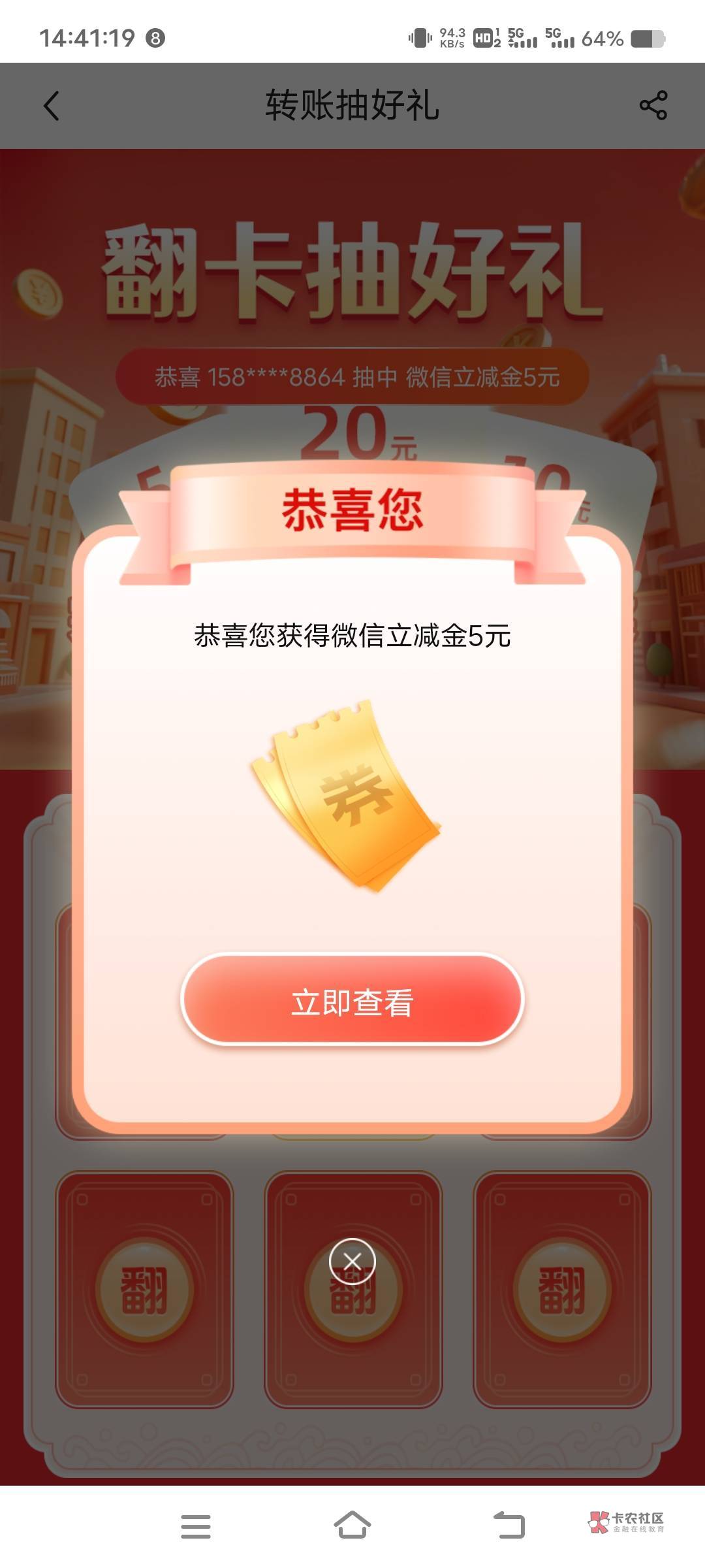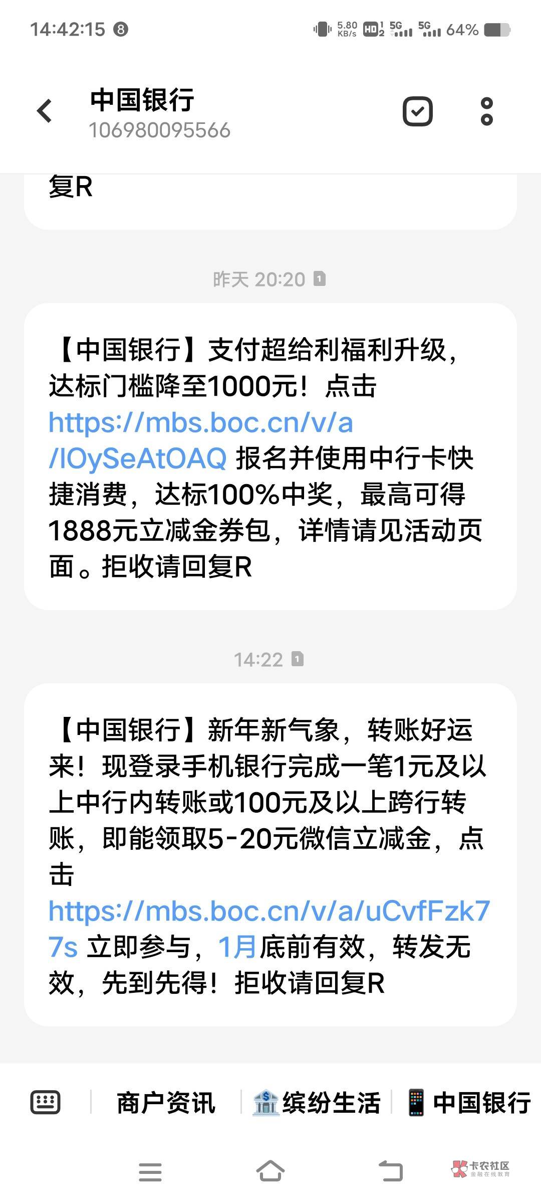 【中国银行】新年新气象,转账好运来!现登录手机银行完成一笔1元及以上中行内转账或100元及以上跨行转账,即能领取5-20元微信立减金,点击 https://mbs.boc.cn/v/a/uCvfFzk77s 立即参与,1月底前有效,转发无效,先到先得!拒收请回复R