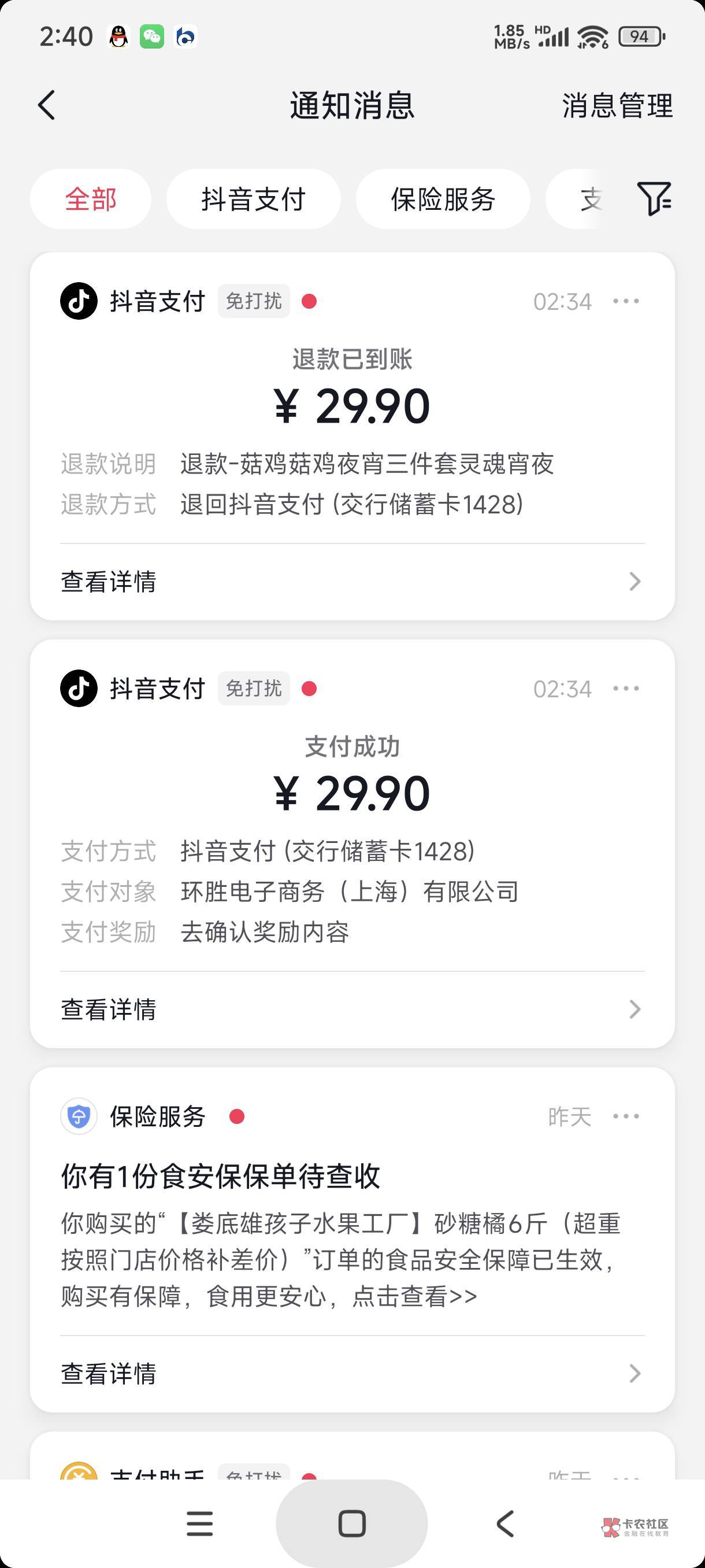 他是原本抖音下单就用了29.9才退款29.9的是吗