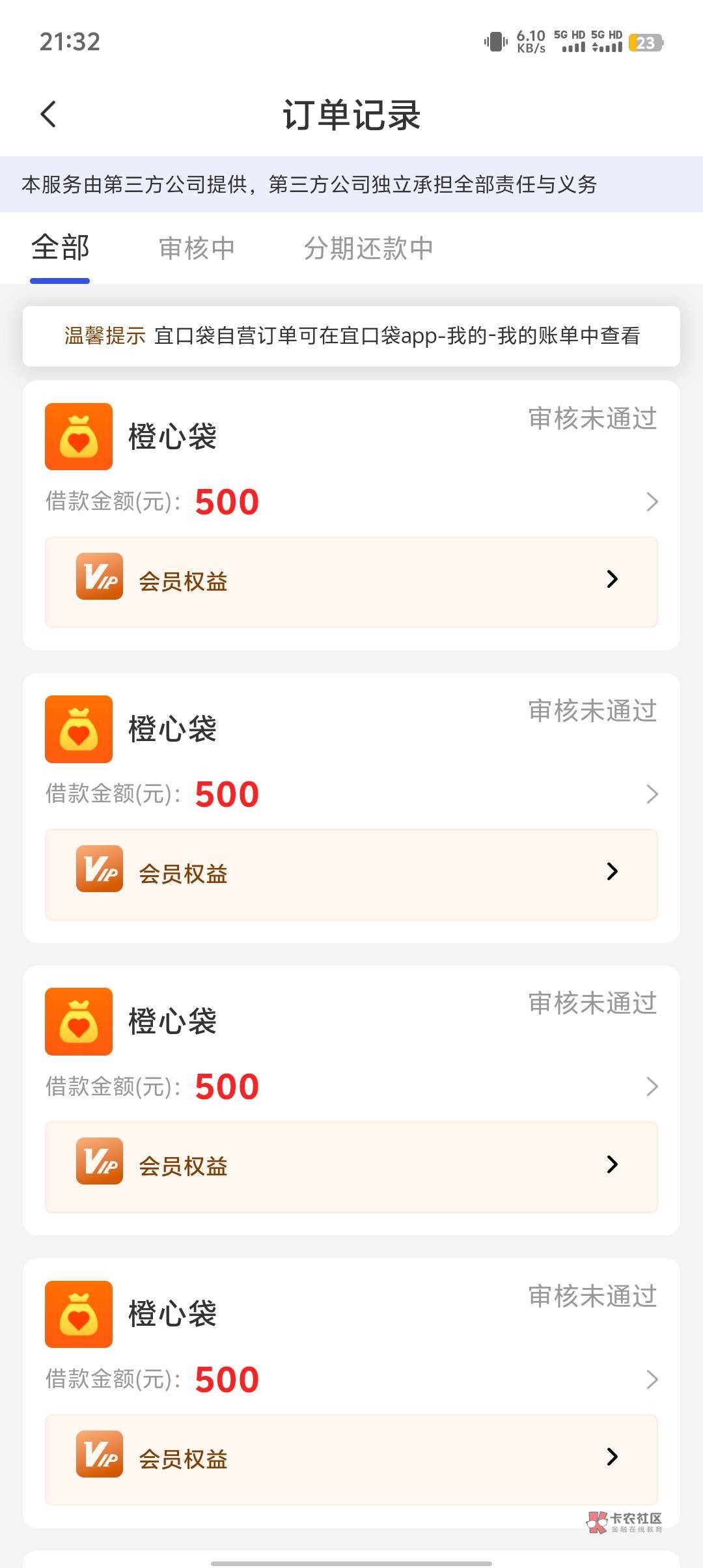 还款日下了500剩下500申请就拒绝去橙心贷本体一看秒拒