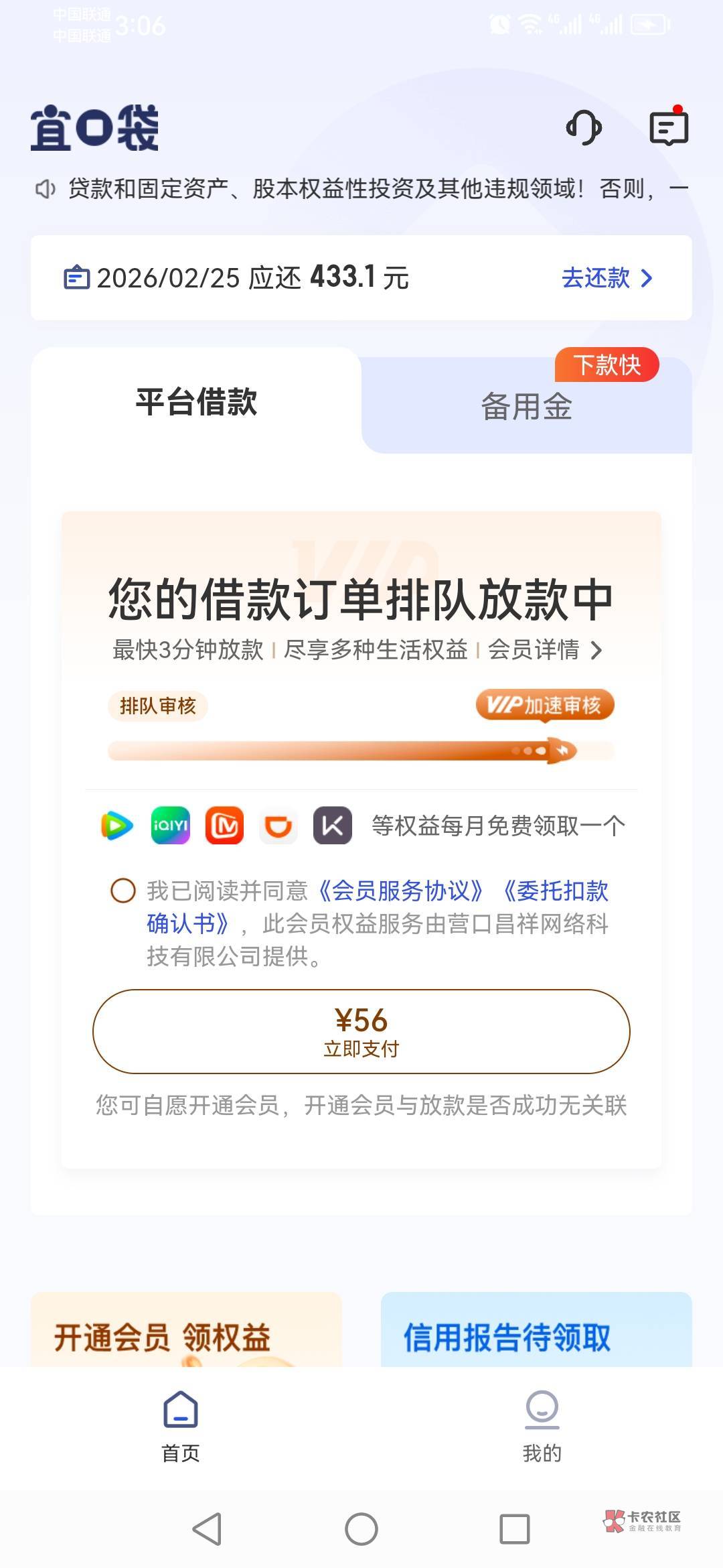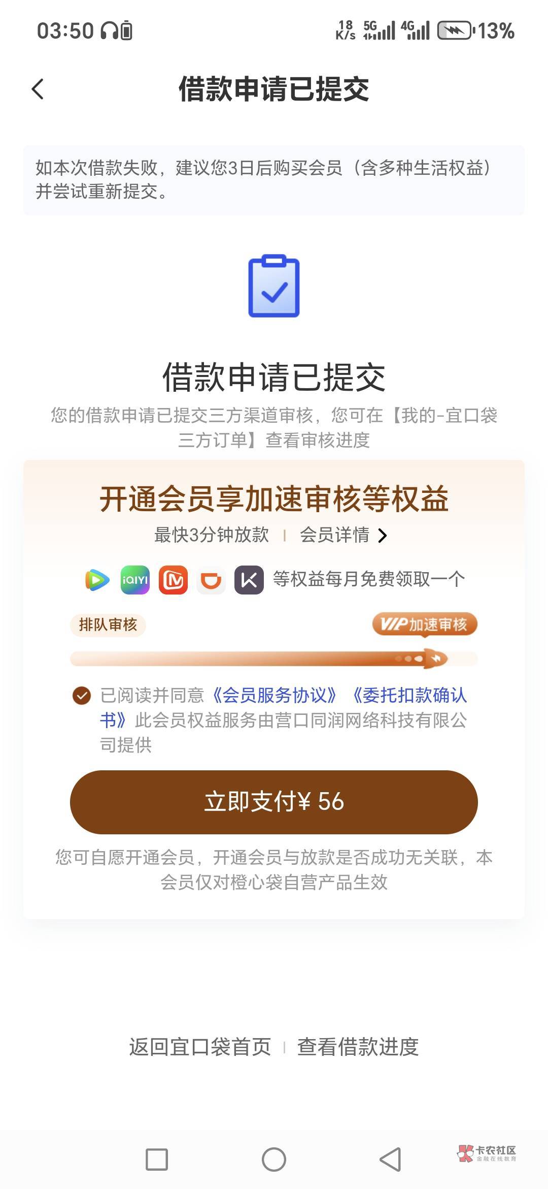 我上一笔也是没付,这次就跳出要付56,应该是付了就审核比较快,成功率比较高吧