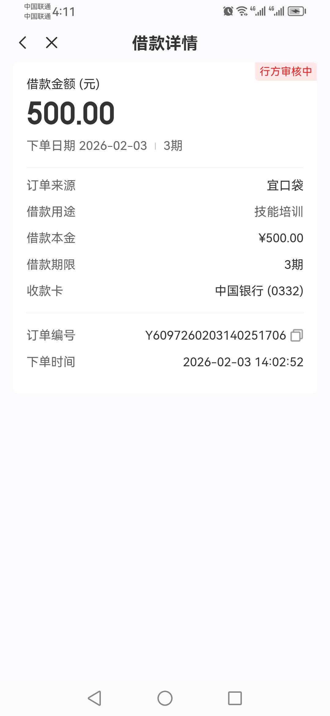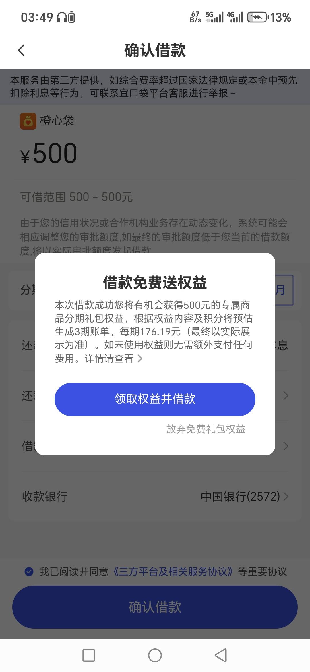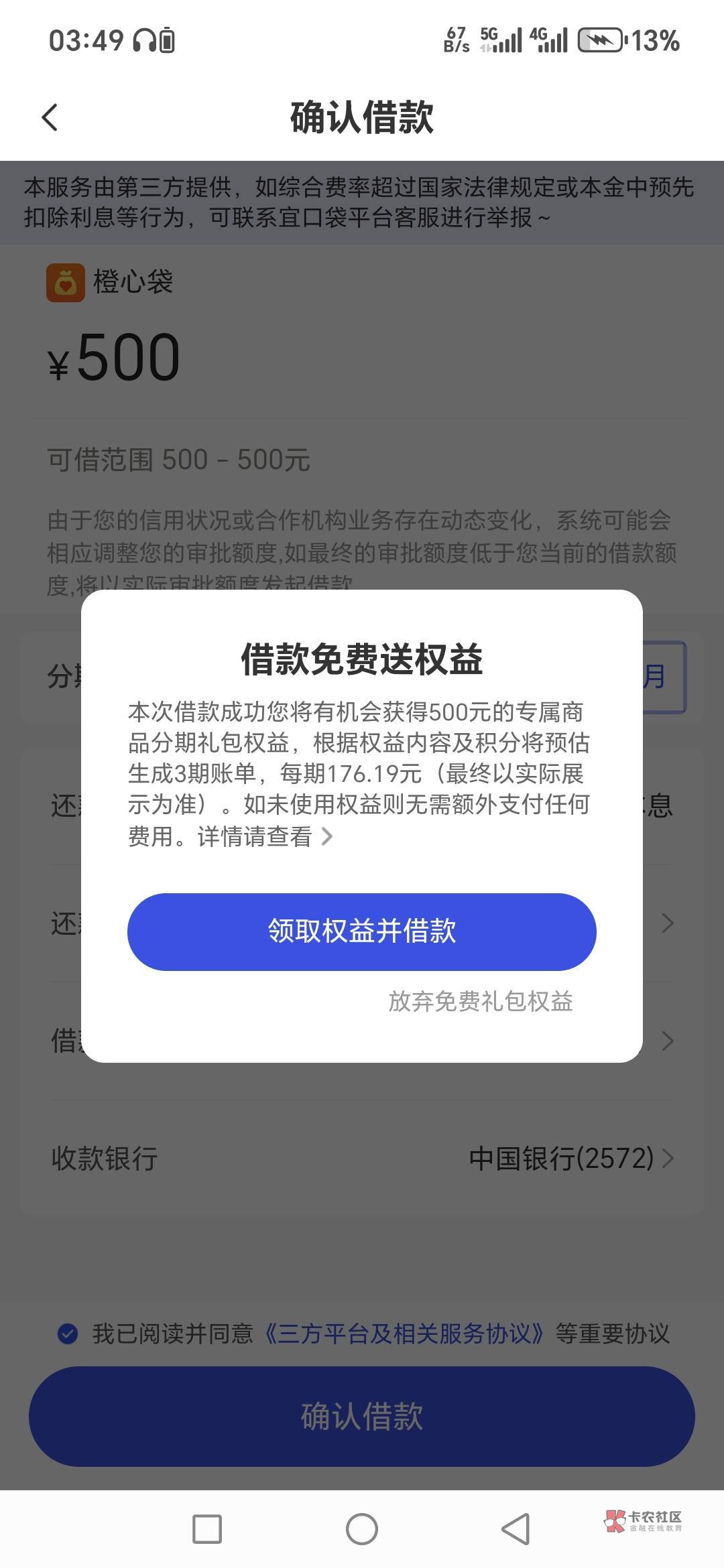 三个500,这种是你前面的先用后付没扣,白天会给你打电话让你付,付了不一定过,不付一定不过,付了过了,他还要扣56的,要手速快