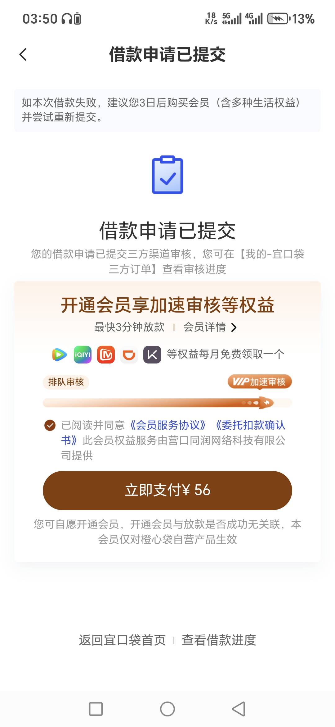 我也是你这样,我就付了56,会下款吗??上一笔点的先想后附没扣,之前一直创建会员失败,刚刚点了一下就要让支付,现在显示放款中