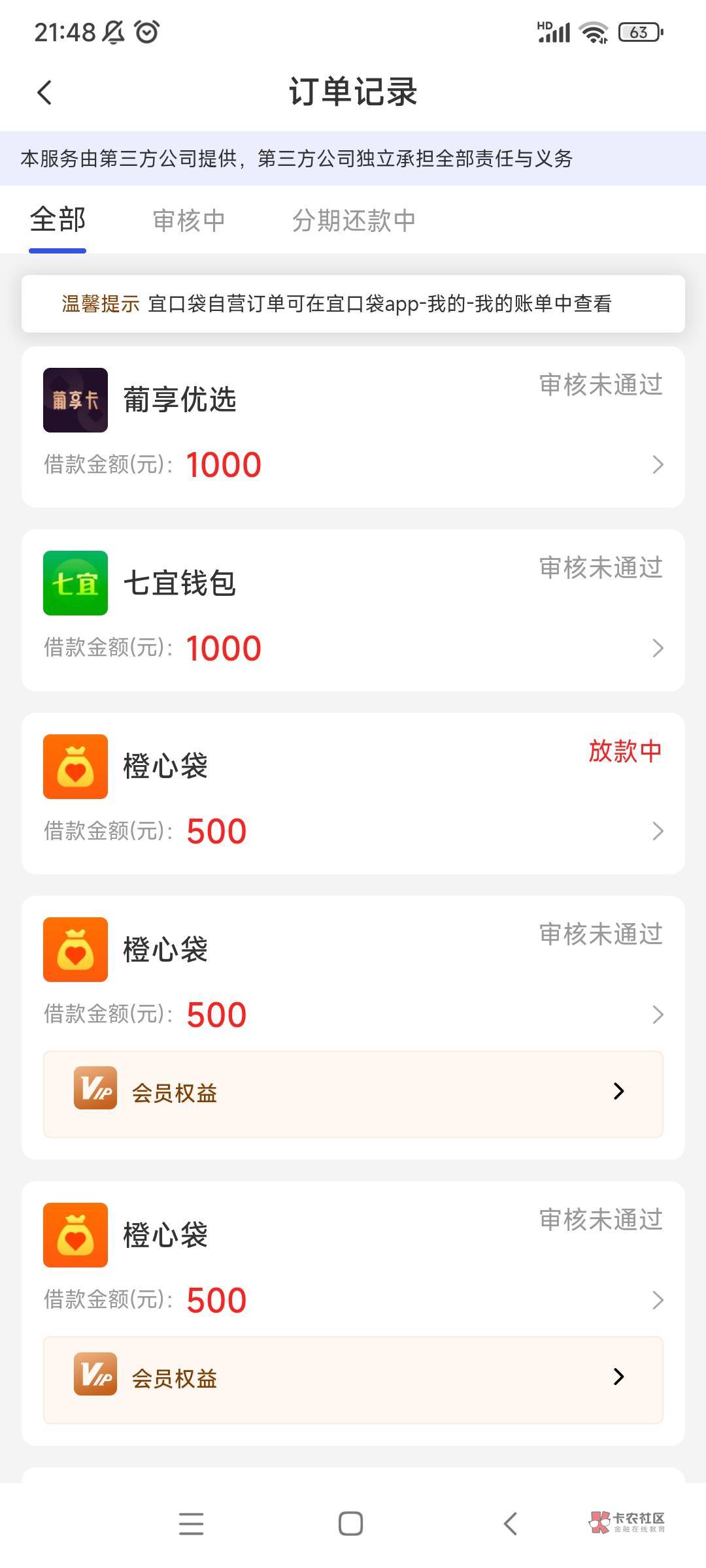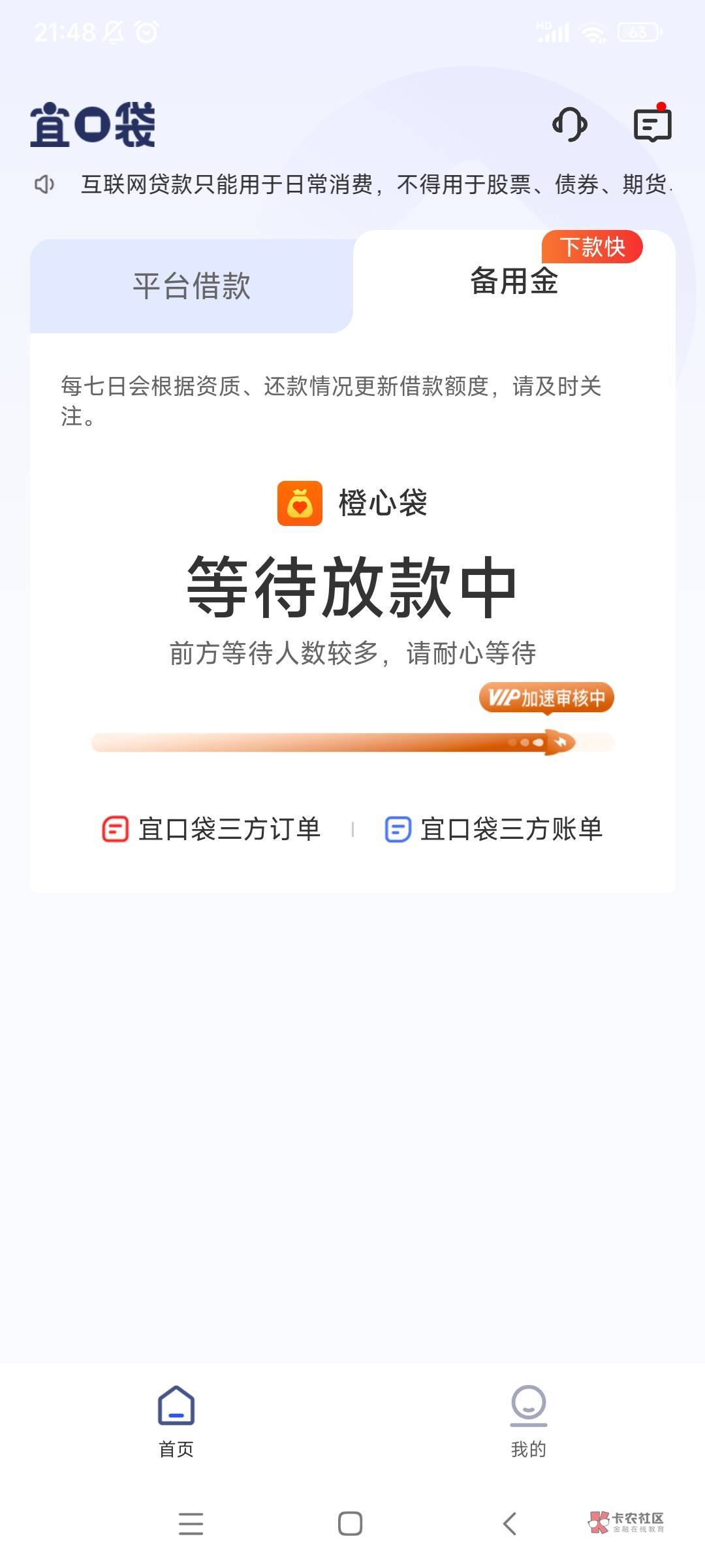 一样,第二笔今天可以申请了 今天第一次点了先用后付直接审核失败 过了几个小时打开莫名其妙又有一个500的订单了 又点了一次先用后付 现在宜口袋显示放款中 橙心贷显示行方审核中 不知道能不能下