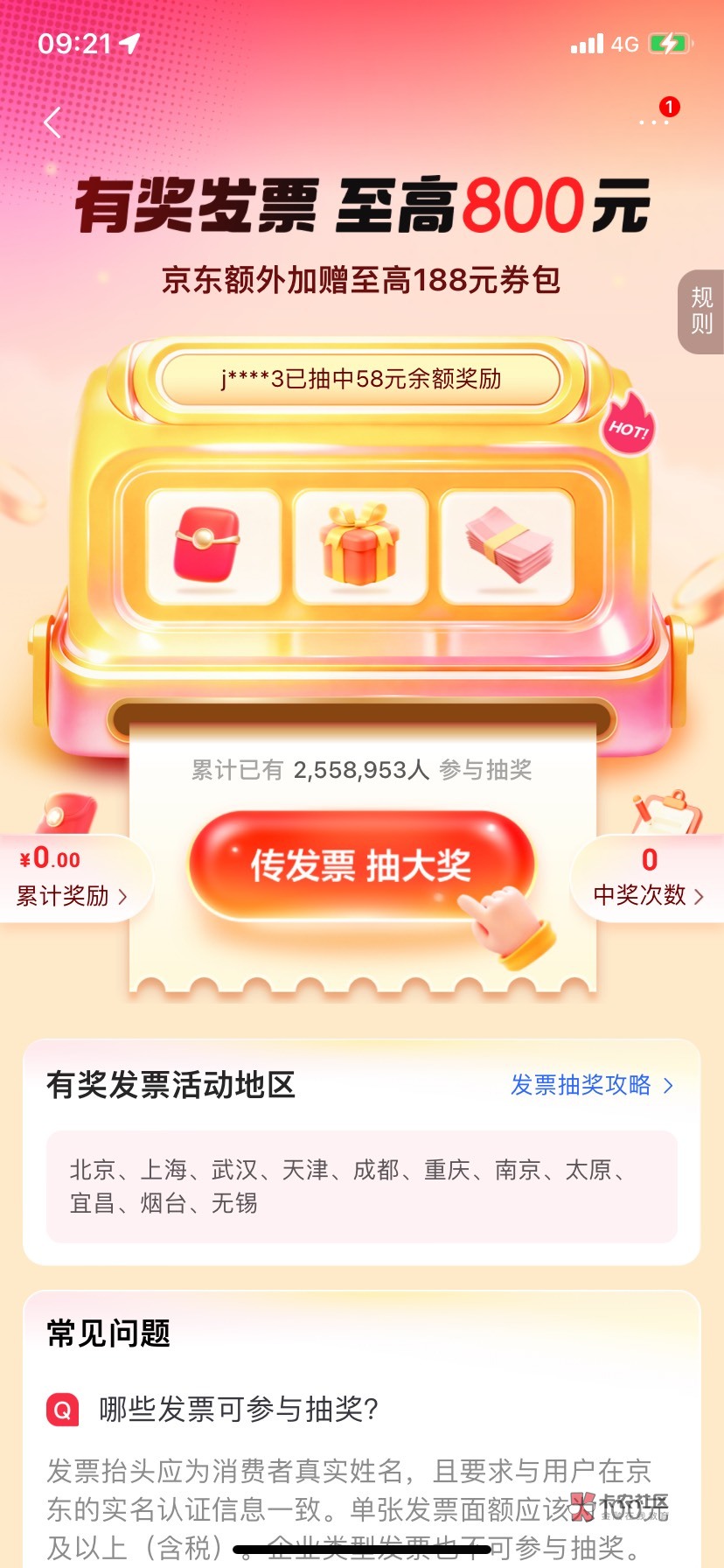 京东搜发票抽奖,进去活动上面有一键换开,把发票重开了 或者不够金额合并开,要100以上 注意发票排头要你的名字 开好就可以抽了