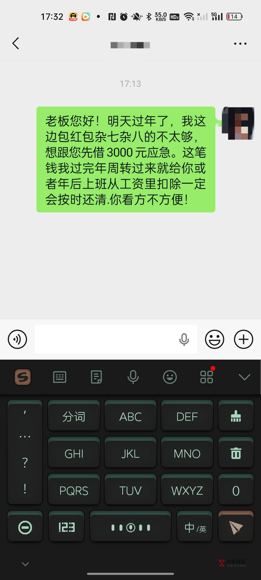 几年前上班的时候,刚上班3个月就跟老板结了2w,秒P,那时候月薪才4k,后来断断续续跟他借了4w左右