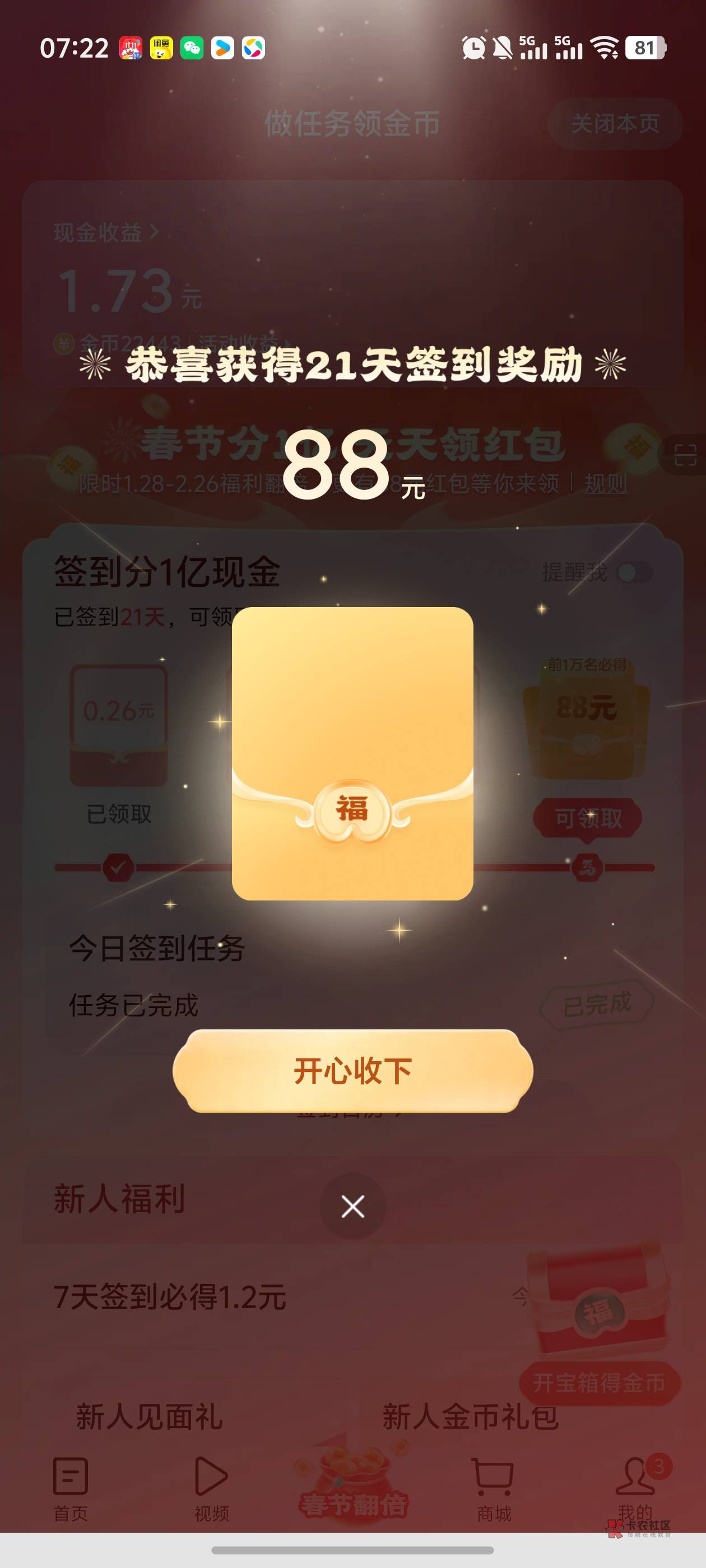看视频 看文章都行,把需要签到的任务日期表打开, 一个手机点补1日 另一个点补2号