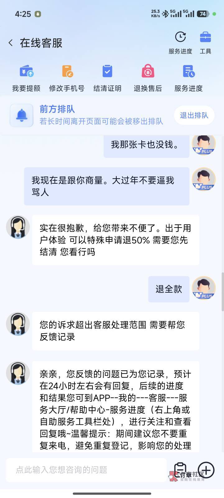 开始就要强硬点我也是开始退50我说必须全退然后就退了