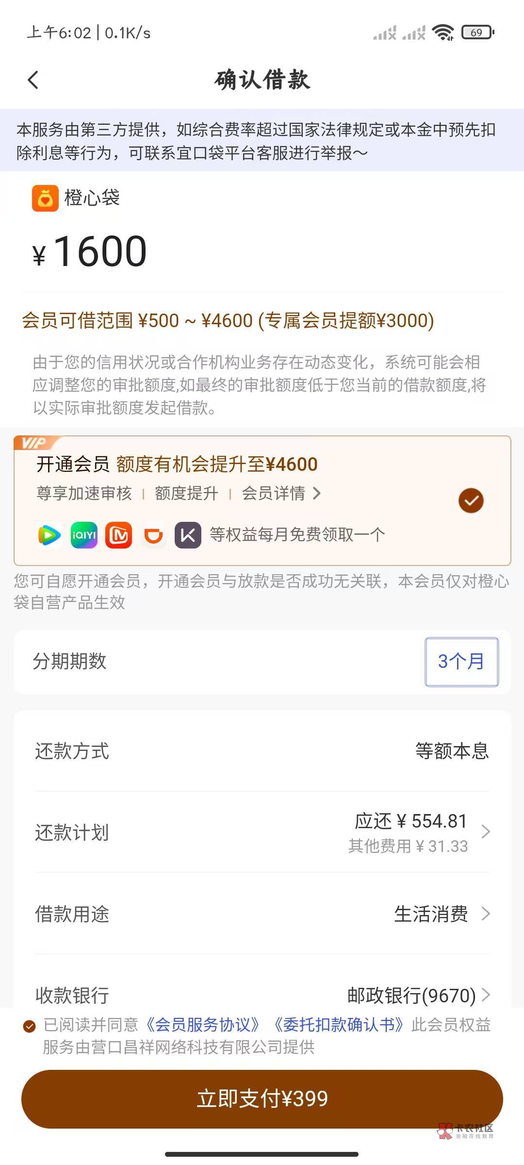 截止发稿前确定橙心贷下款,还有额度,再申请就没有先用后付待遇了,会员三百多,是不是因为没扣到?