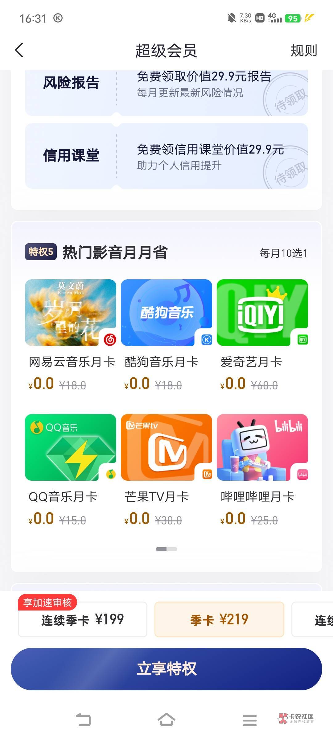 等,会员那里显示没季卡才行