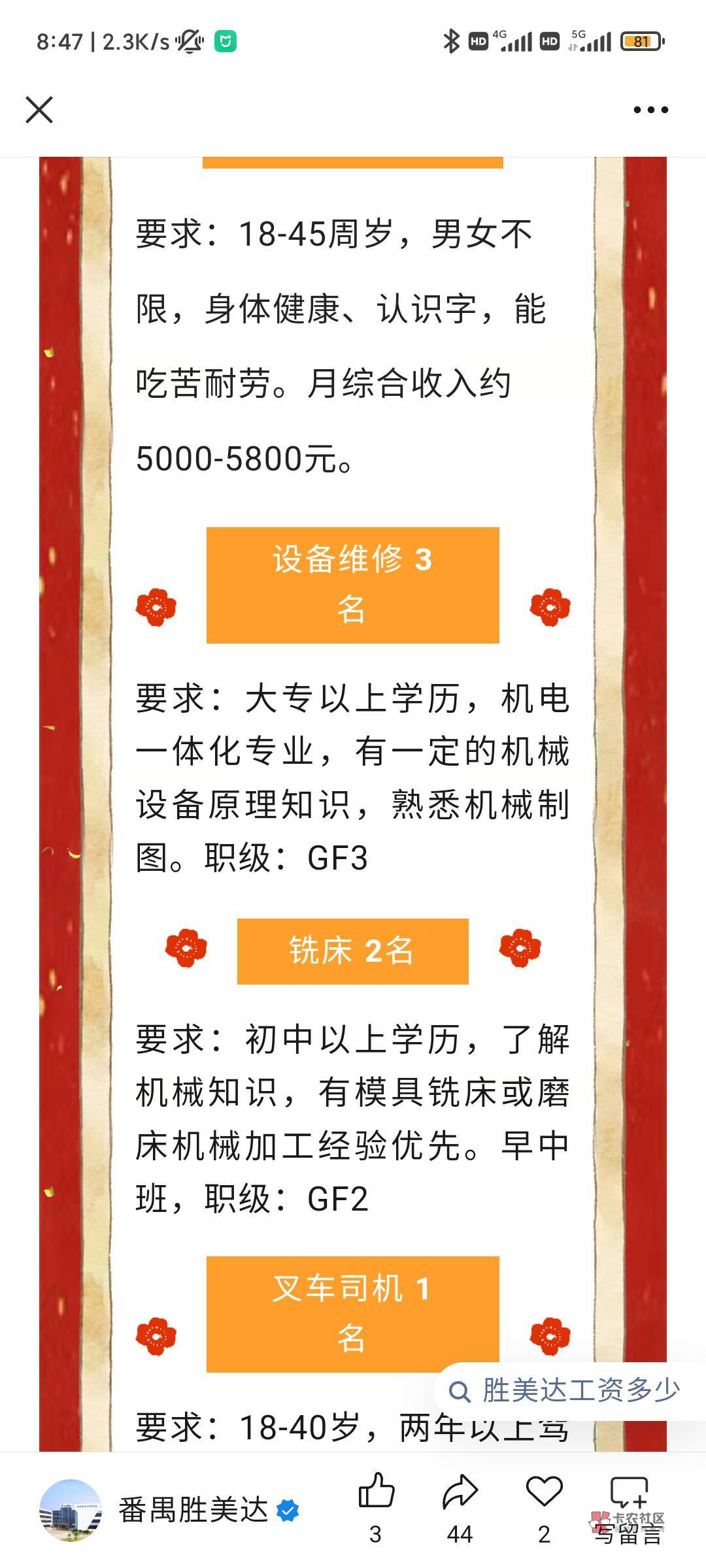 嗯,这个基本工资确实太低了,我记得我们这普通最低标准是2900,每年涨100,设备维修应该更多,我之前在电装是3200底薪
