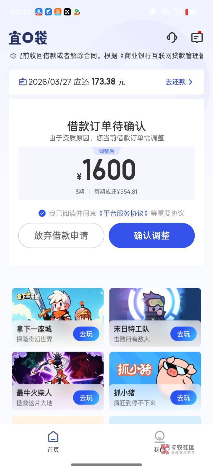 看我历史帖子,你这应该是宜口袋本体第二笔500额度申请拒了然后跳出来1600的额度,我都等2天2夜了,还在行方审核,感觉不稳