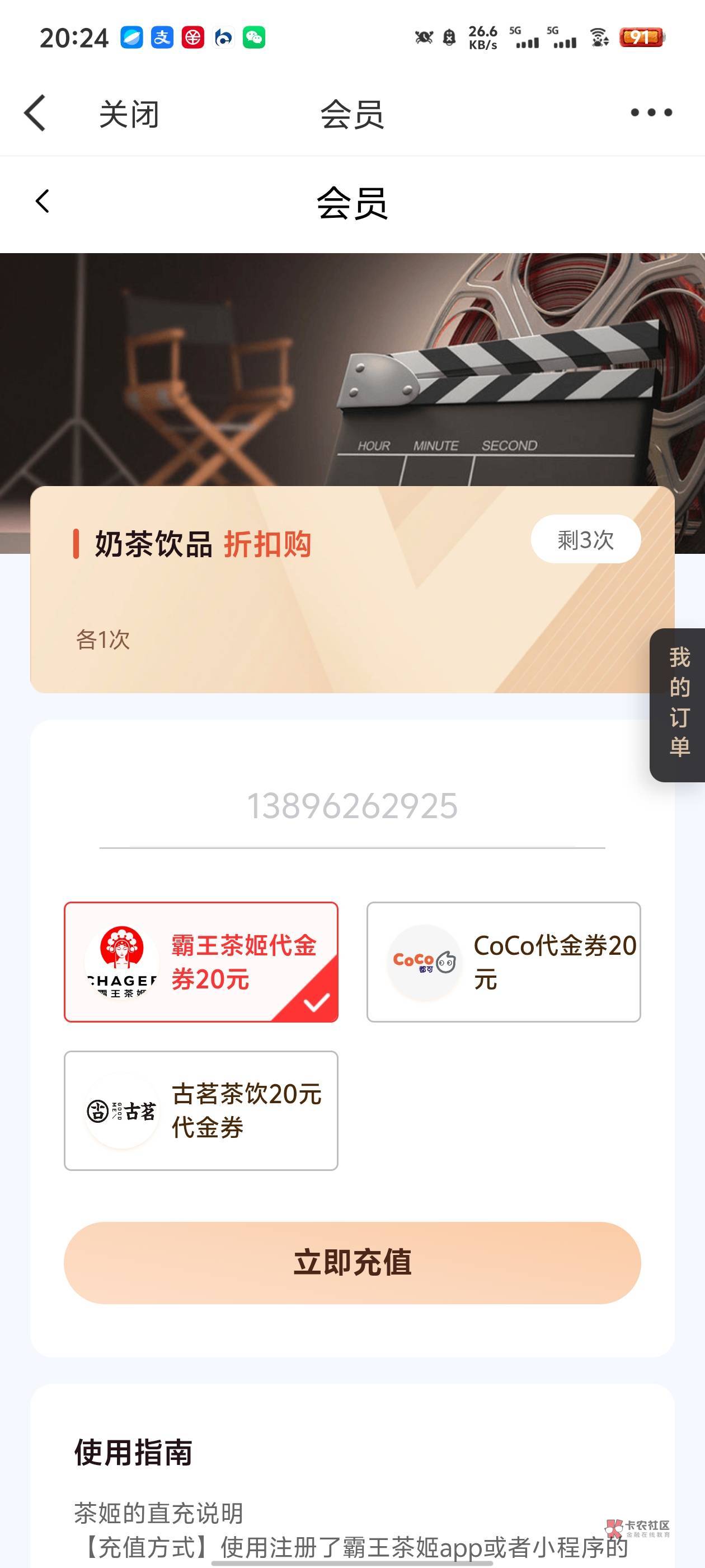 返回去。点立即领取,再选择霸王茶姬。你从外面直接点霸王茶姬就一直是原来的手机号