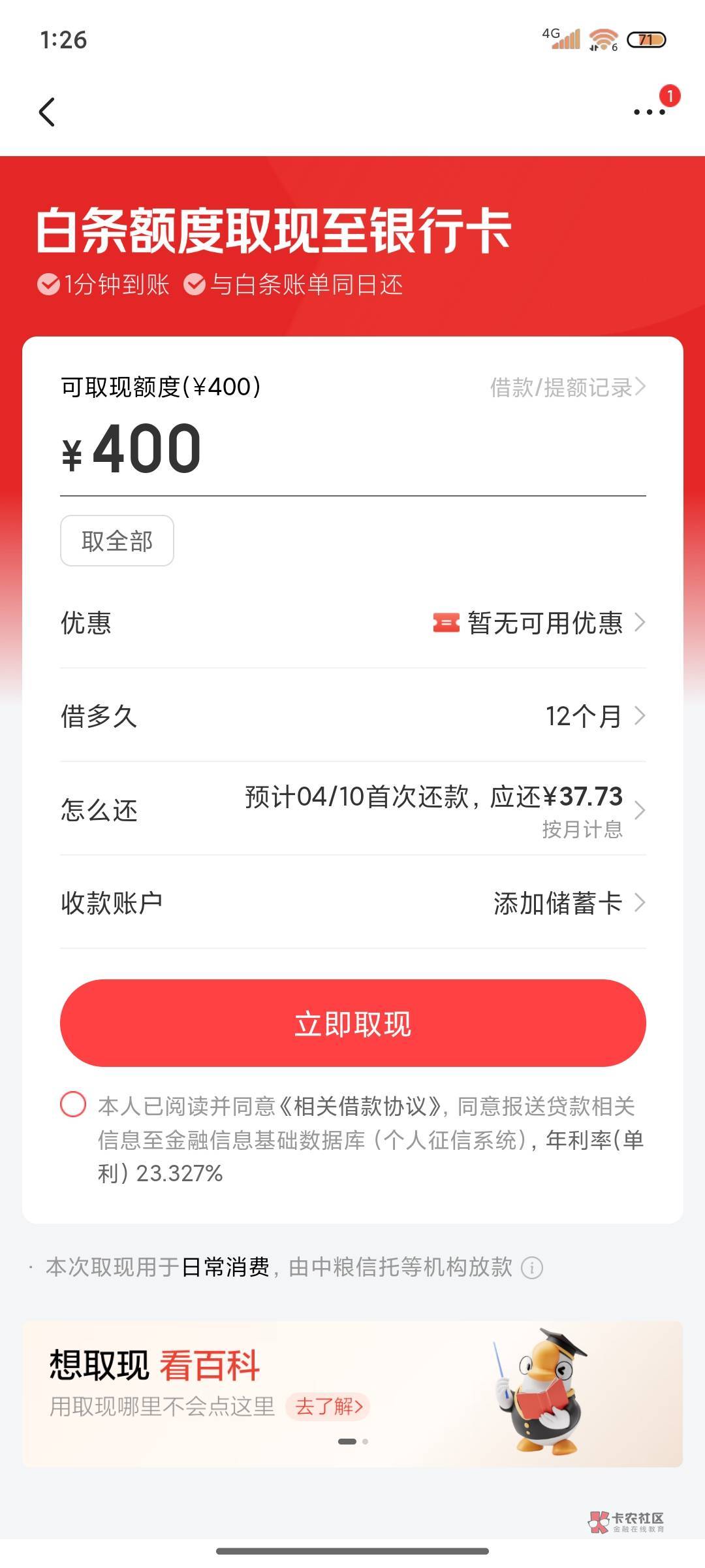 我今天重新开一样给了五百,但是没有金条也是四百取现,分分卡都开不了