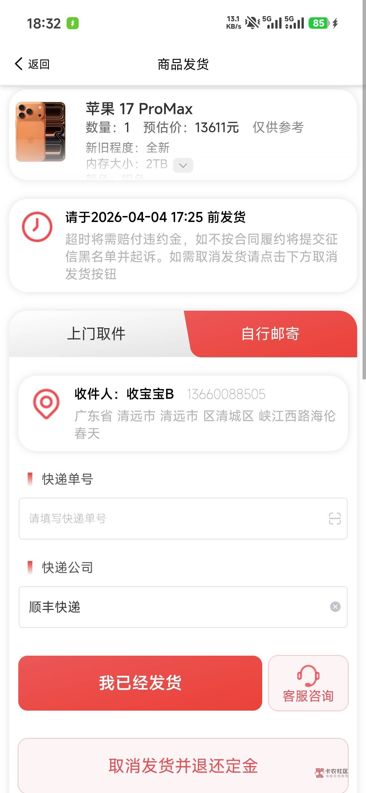 不用发货啊,就是借款10天,到期还钱。回收手机是个壳子而已