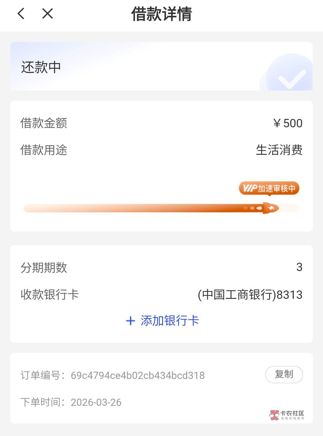 19号审核7天一直没过,中途我就退了宜口袋本体三笔会员和橙心贷一笔,26号又重新申请,没抱希望了,收到短信说自动还款,看了账单才发现下午扣了1.3,估计是测试吧