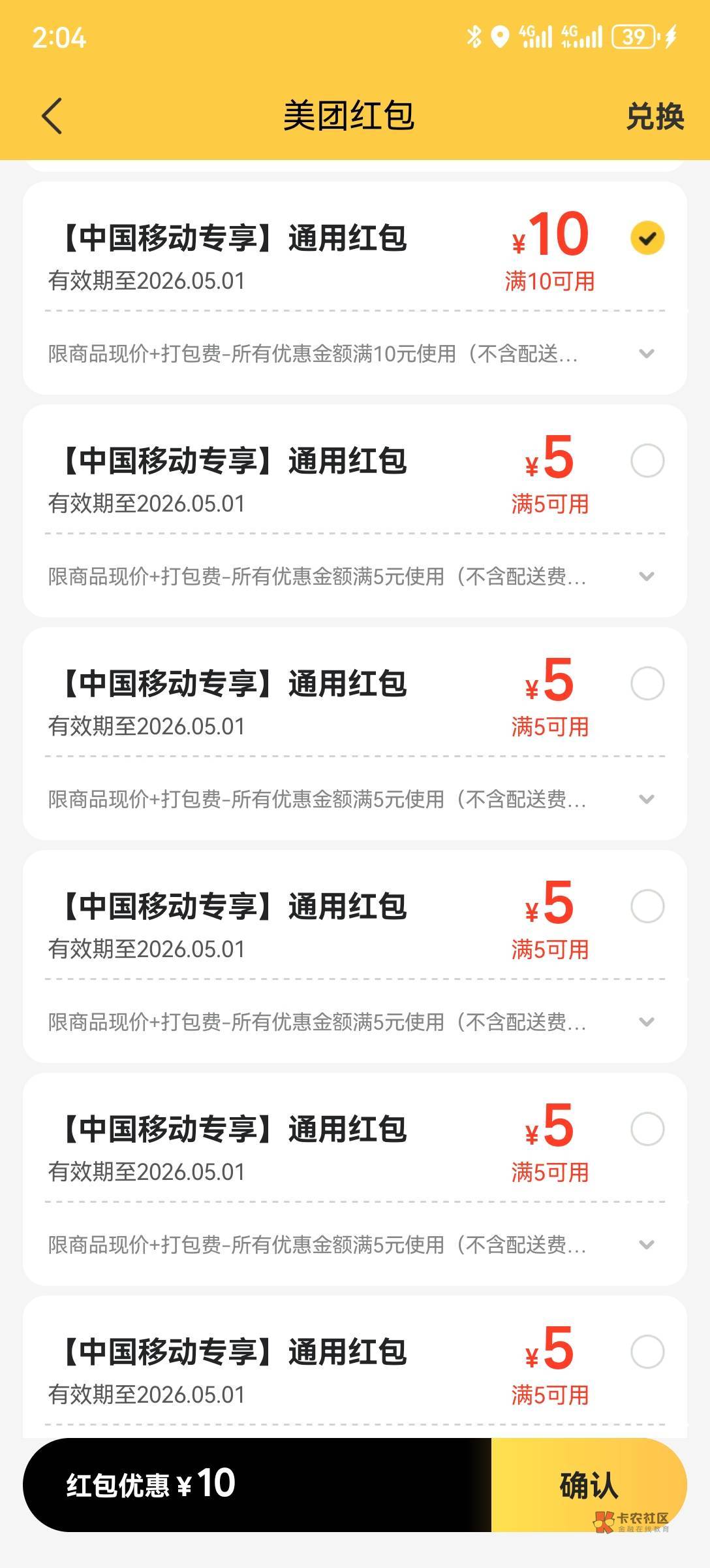10的红包,正好0元购3瓶快乐水。5的,就没啥用。