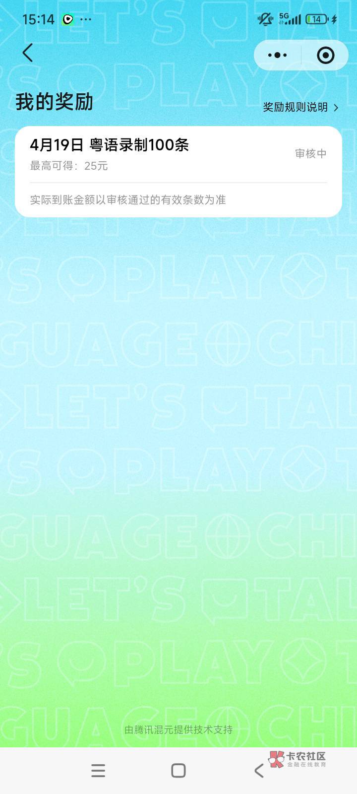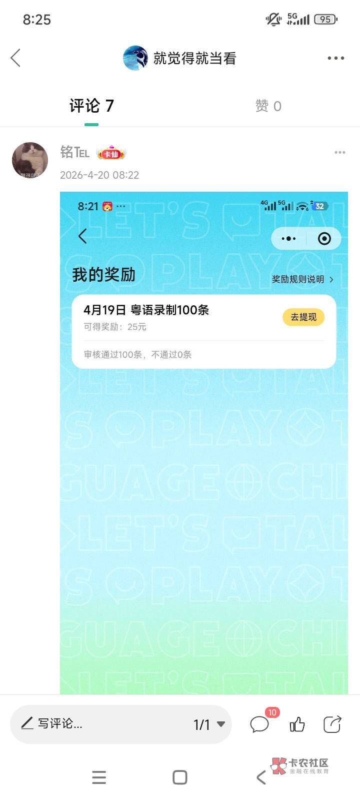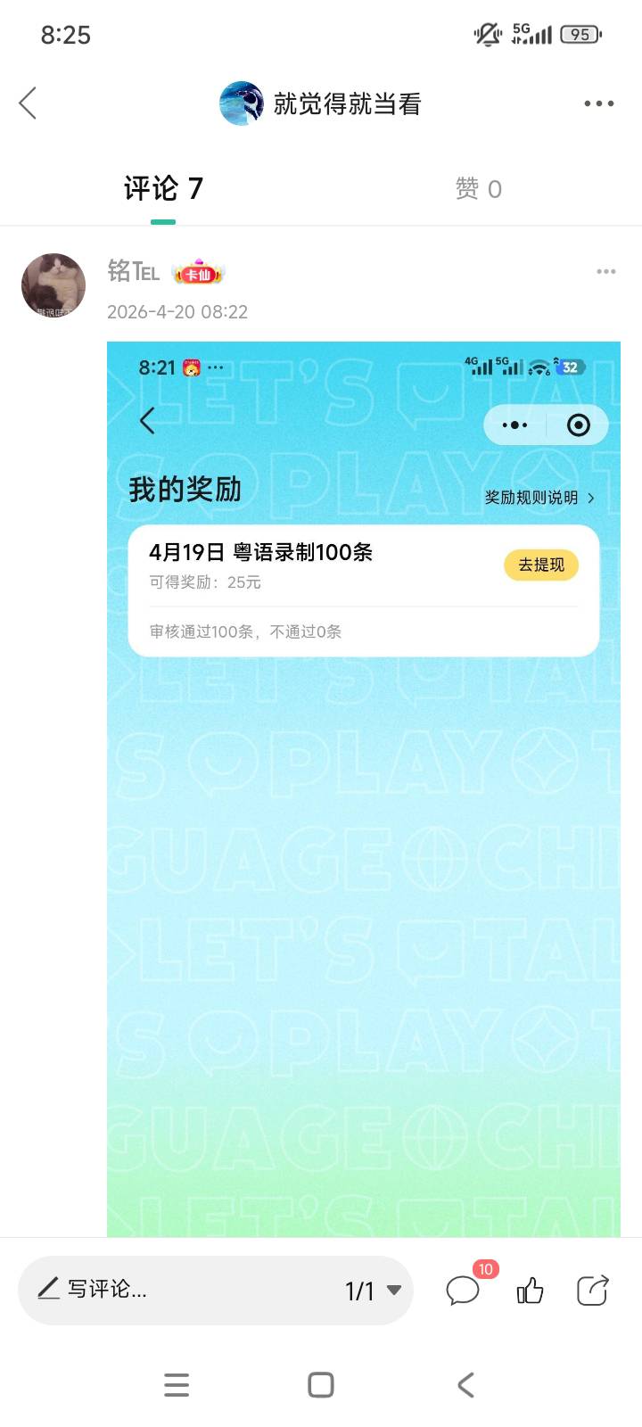 0.25一句话,一天最高100句,审核通过一个号25。我已经录了40个号。说了快1万句话了,都在审核中,不知道到不到。