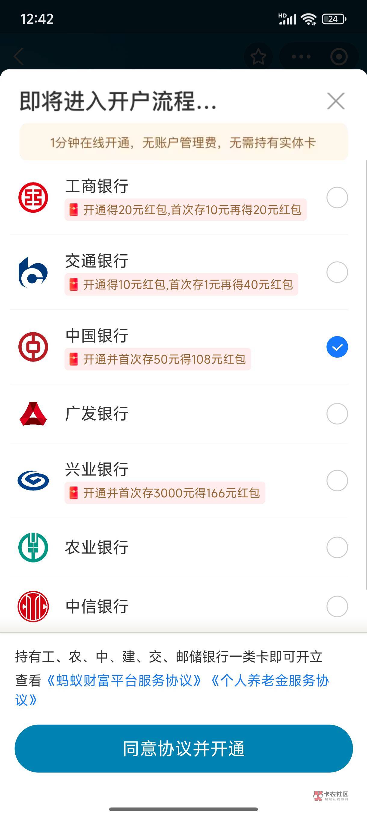 我是支付宝开的中行,直接就给机会了