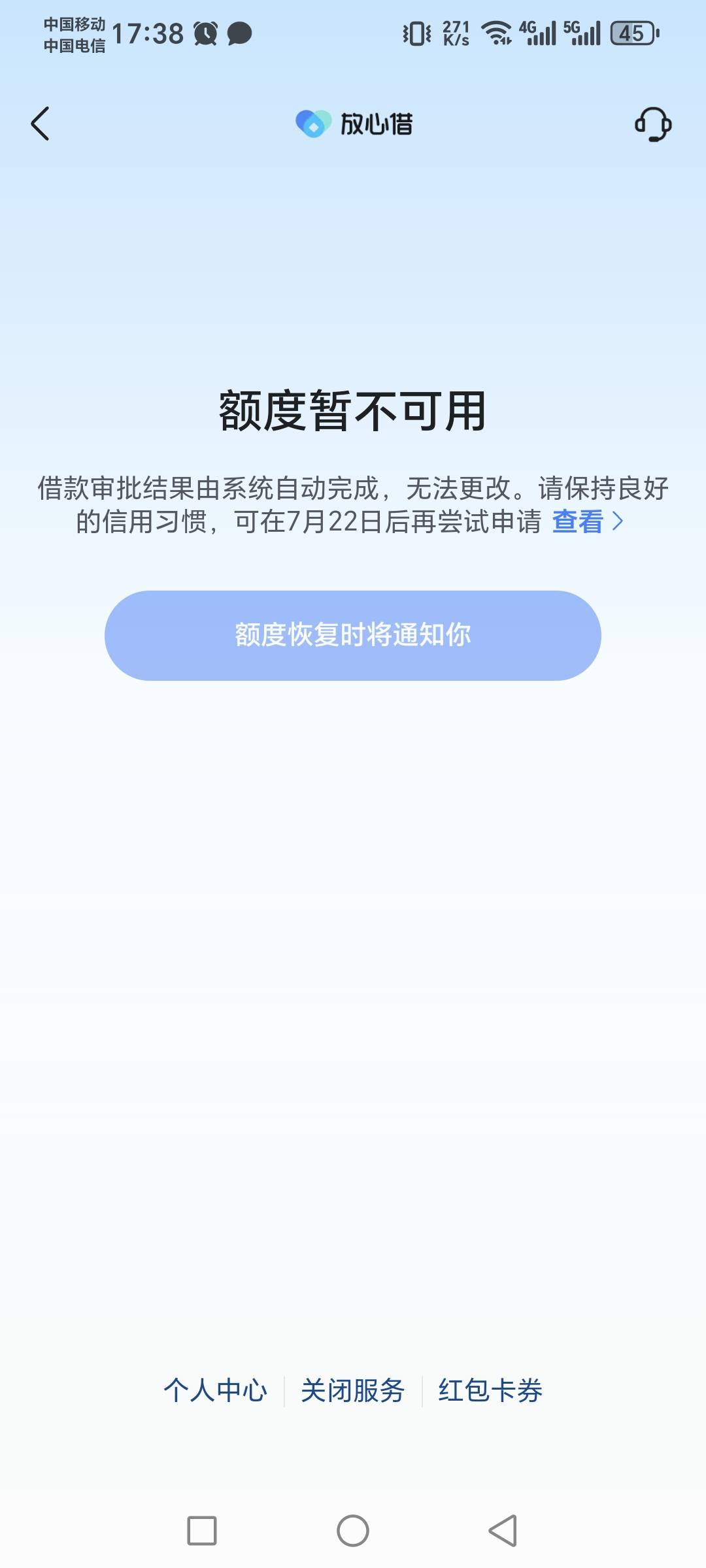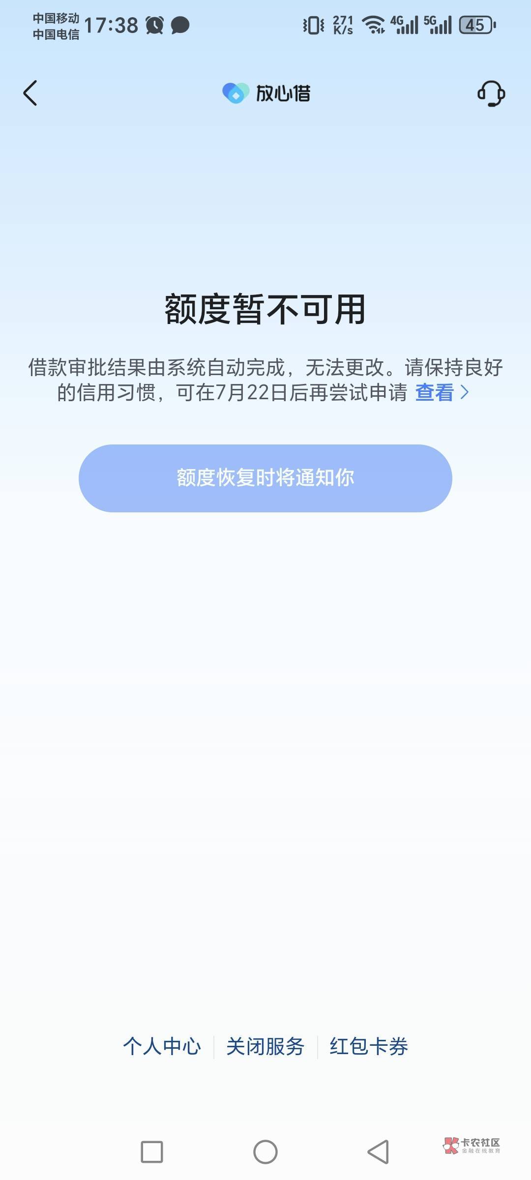注销完抖音支付,在皮皮虾打开放心借,直接就是这个界面,连申请都不让申请。