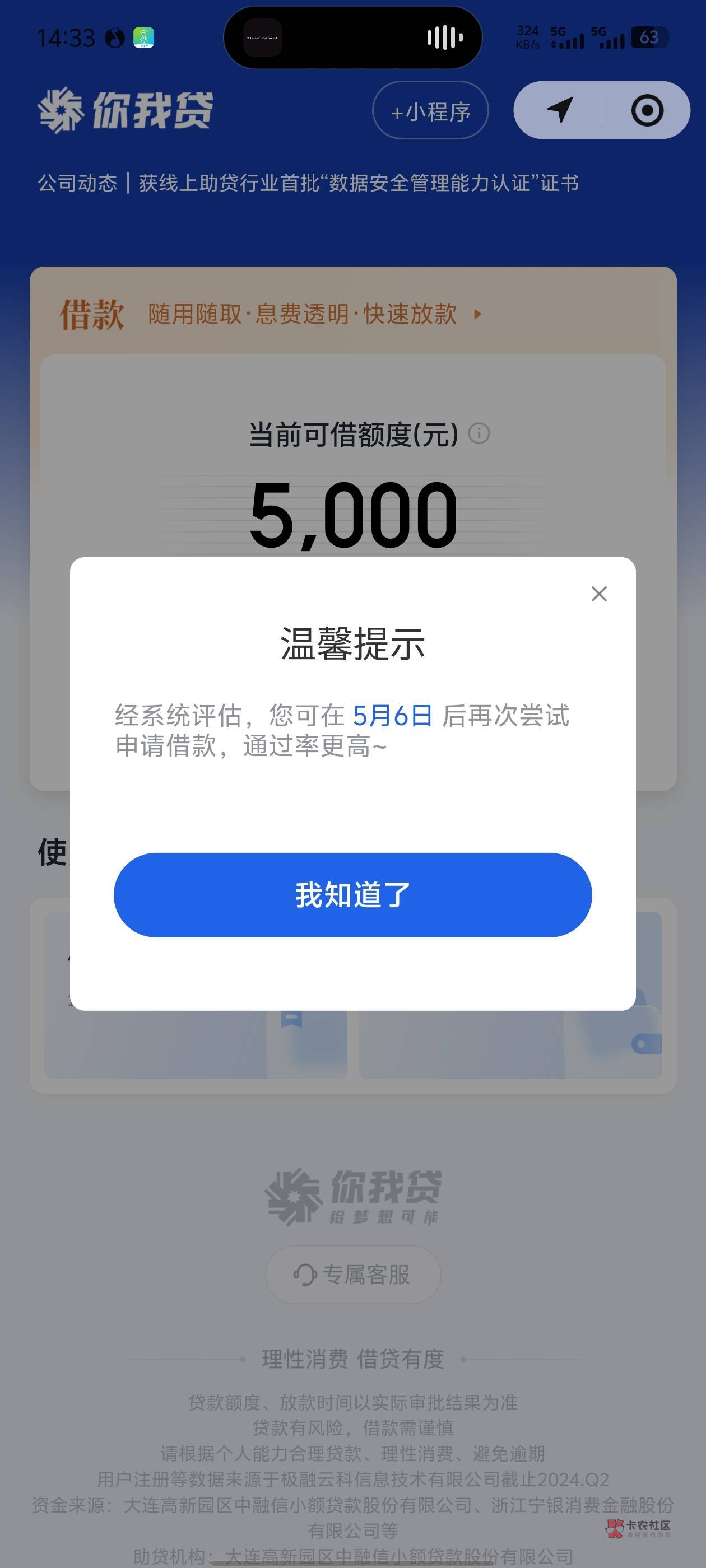 我有7w额度 点击就提示这个 估计是黑屋吧 不知道啥时候让用 哎 太难了
