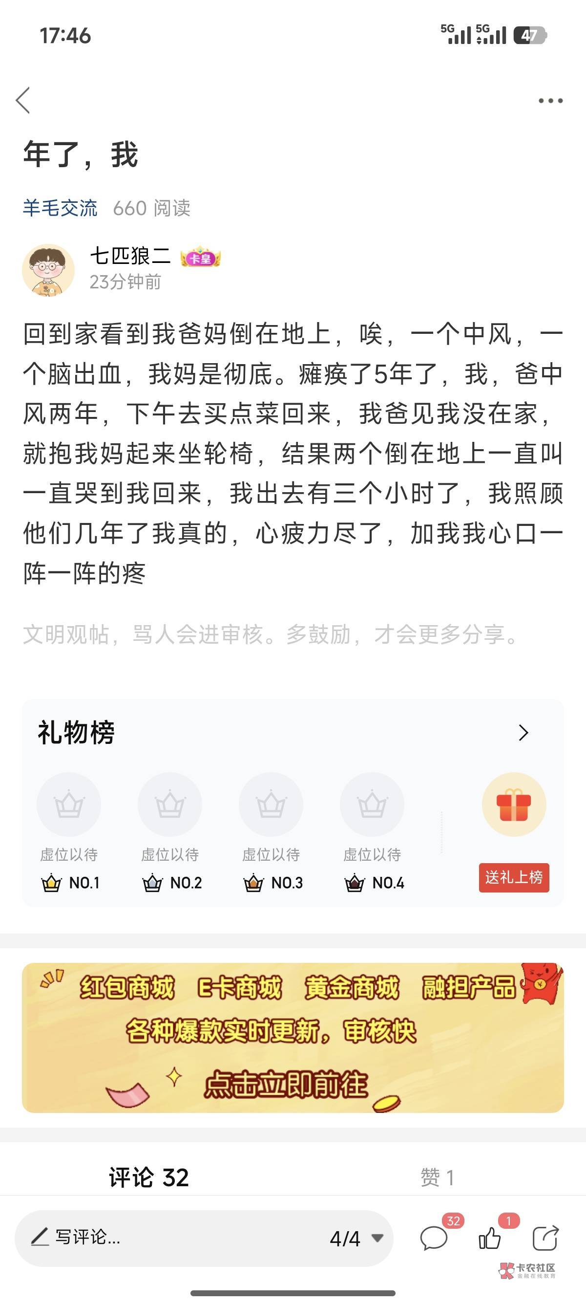 唉,不知道怎么说,仿佛看到了我的未来,家里没积蓄,一家人都有小病,都在吃药续命,活一天算一天吧