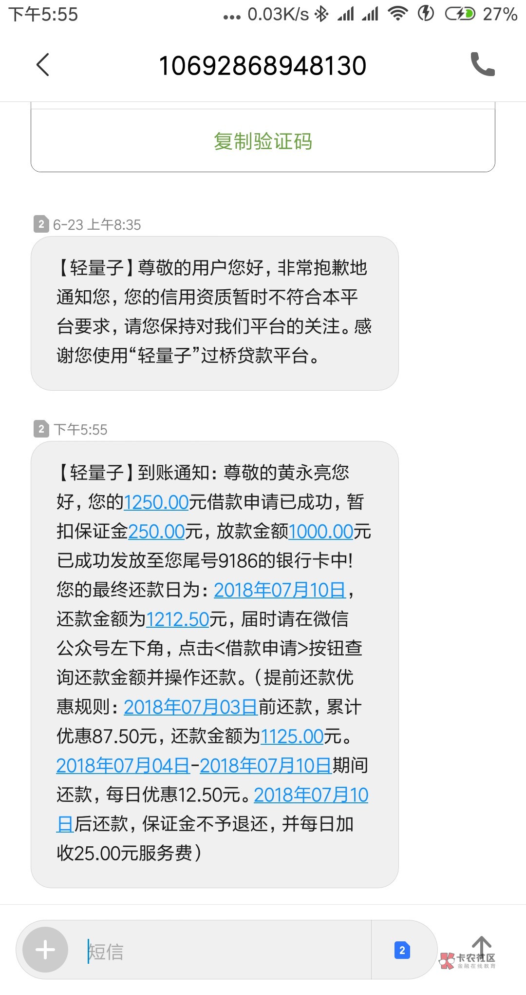拒了谁给我转的钱呢,过了几分钟收到轻量子的通过短信,前天申请的轻量子,现在才到,被拒*惯了,申请1500的拒了20多次,最近申请的1000,也拒了好几次,这下突然下款了