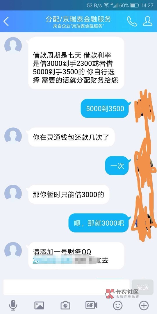 这个是灵通钱包打电话邀请的,灵通钱包我怕套路是续期的,没还过全款…就有客服就打电话叫加QQ免审直接放