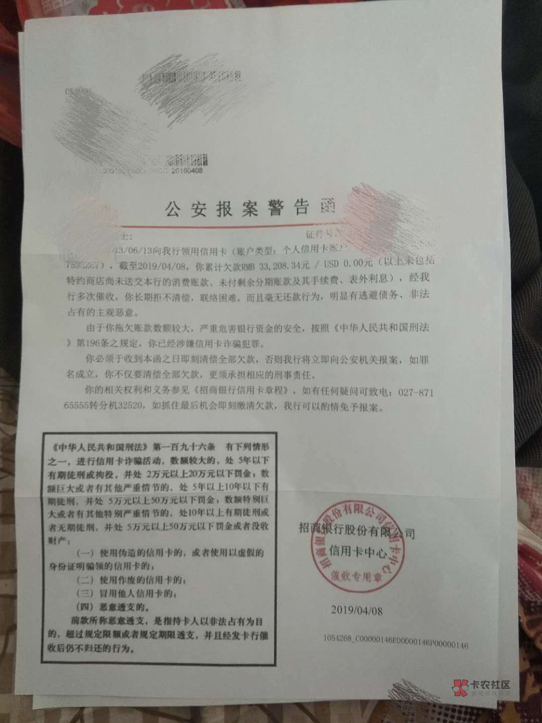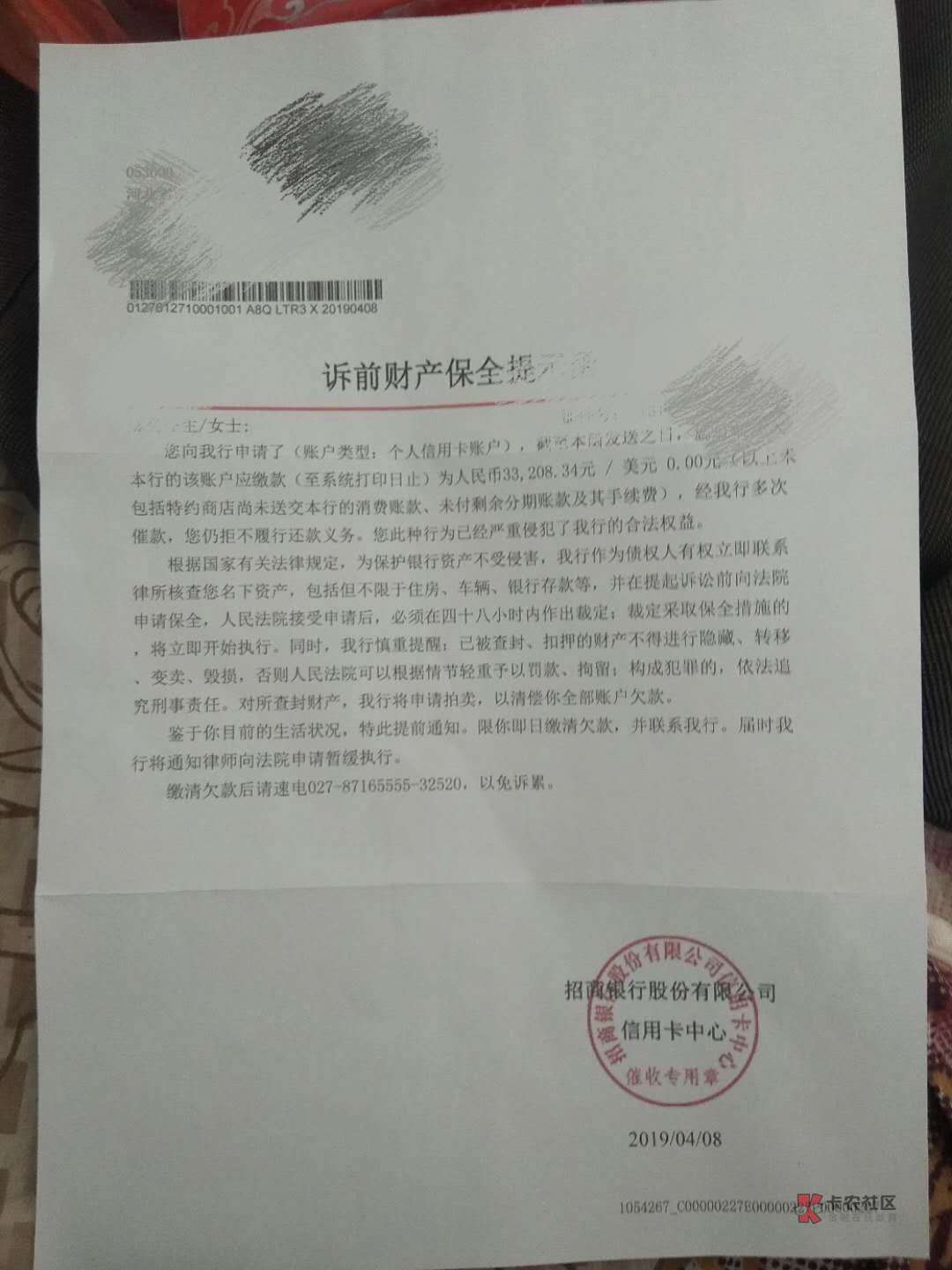 大哥看到那个章了吗?催收专用!!别问我怎么知道的,目前信用卡催收,一般这东西都是我们自己打印的,除了法院传票别的都是外包公司在搞,这个最多法院传票下来也就拘留你15天没多大的事!!