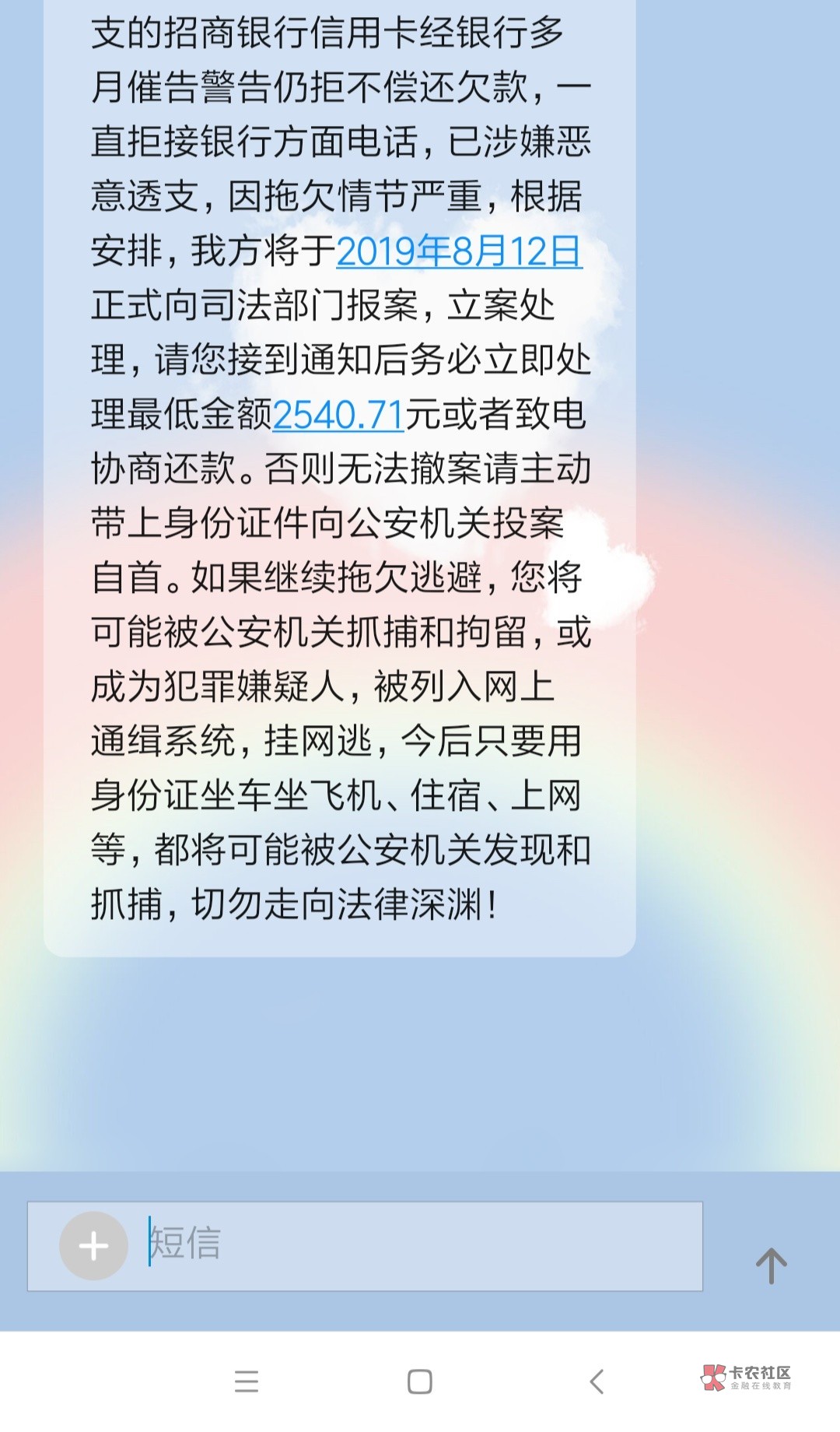 五万以下确实顶多就是起诉,招行不止短信狠,电话催收说话更让你生气,你还没经历,不过也就是吓唬你,让你抓紧还钱,不过招行挺狠的是会冻结你家人的信用卡,如果你是结婚的对象有招行信用卡,或者父母有他家的卡,如果你们还在一个户口上,只要他能查到都会拿这作为要挟你的办法,我老公就被冻结了,还款很好,就一万的账单,怎么投诉也不给开卡,其实银行这个做法就是委t方办的,银行是不会的我老公投诉后,银监会说只有起诉后申请法院来冻结才行,银行没理由冻结第三方的卡,银行说是委t方,但是冻结了我老公也没要求再开,银行让一次性还了然后注销吧,那时没钱还,我老公要求分期,分了12期,现在还的还剩下三期,但是我的卡连分期都不给办,因为逾期太久了,那时逾期三个月了