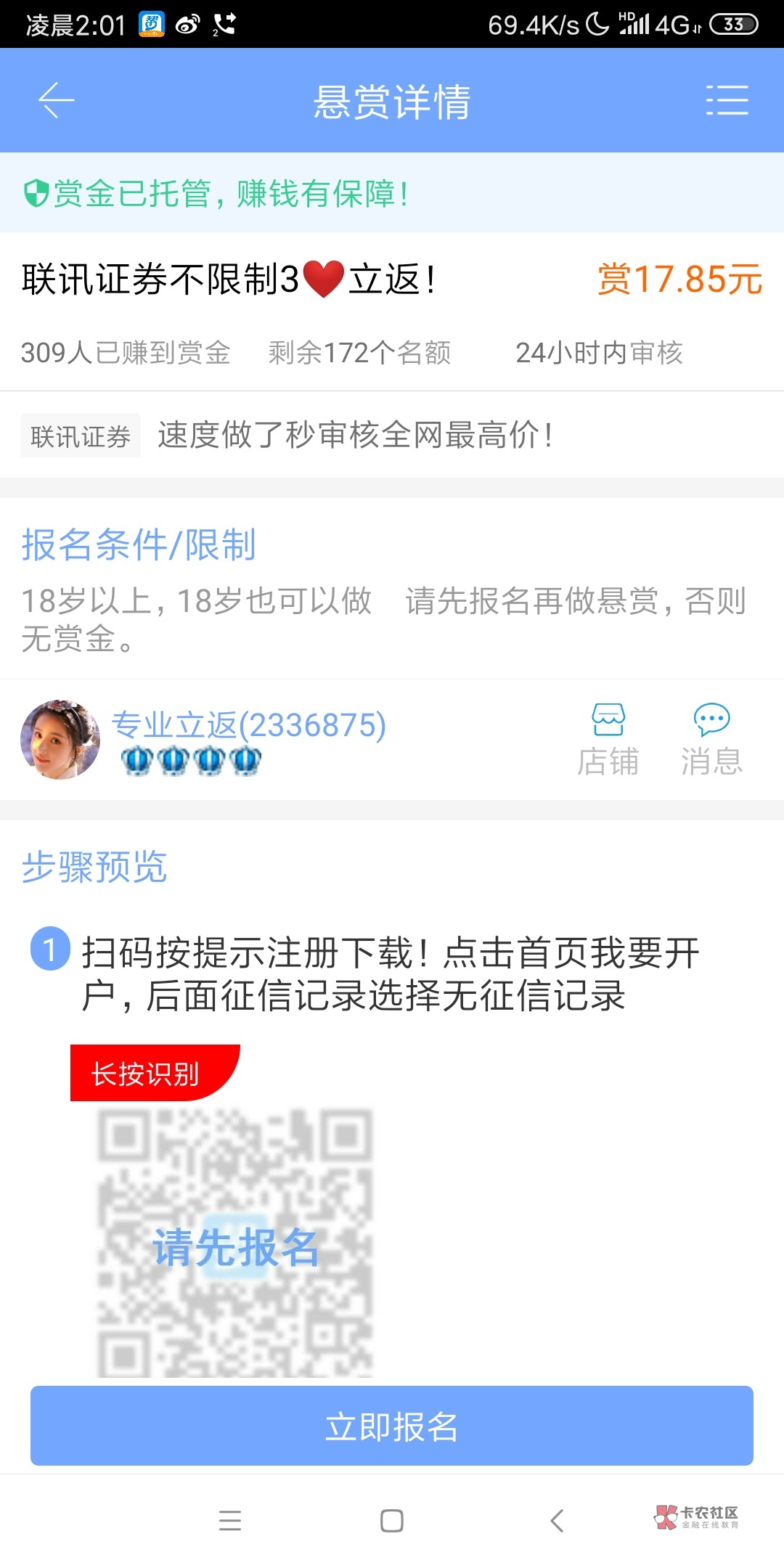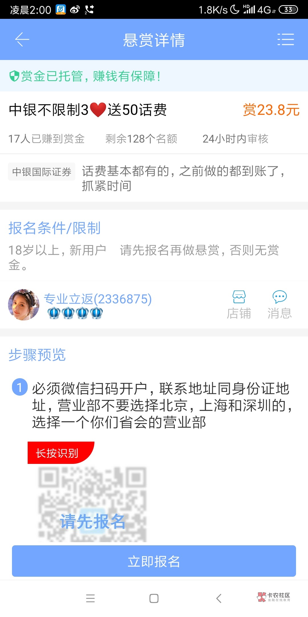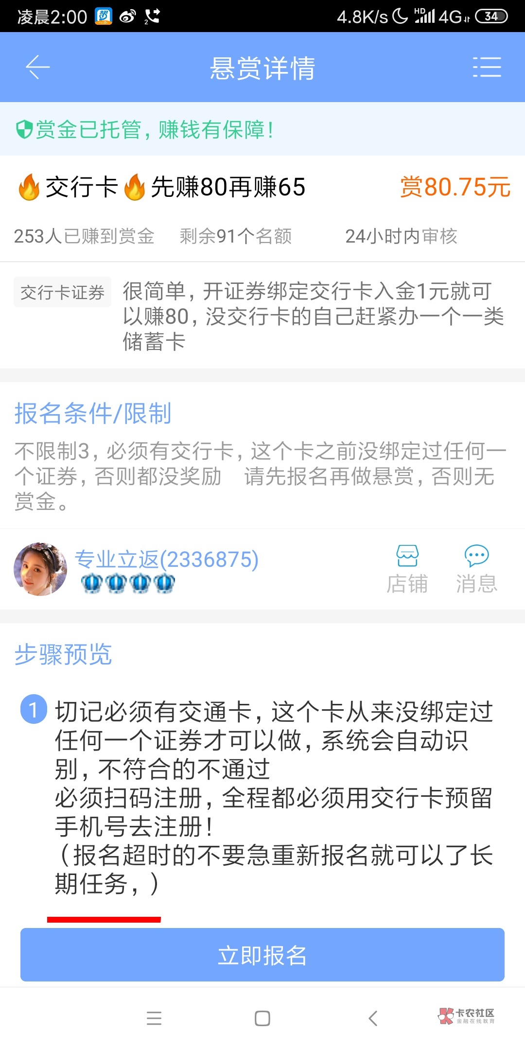 这个股票开户拉人头的,帐号自己用,没什么危害,就是开户多自己名下证券公司账户就多了。工作日才能开。现在最高的是那个交通银行的