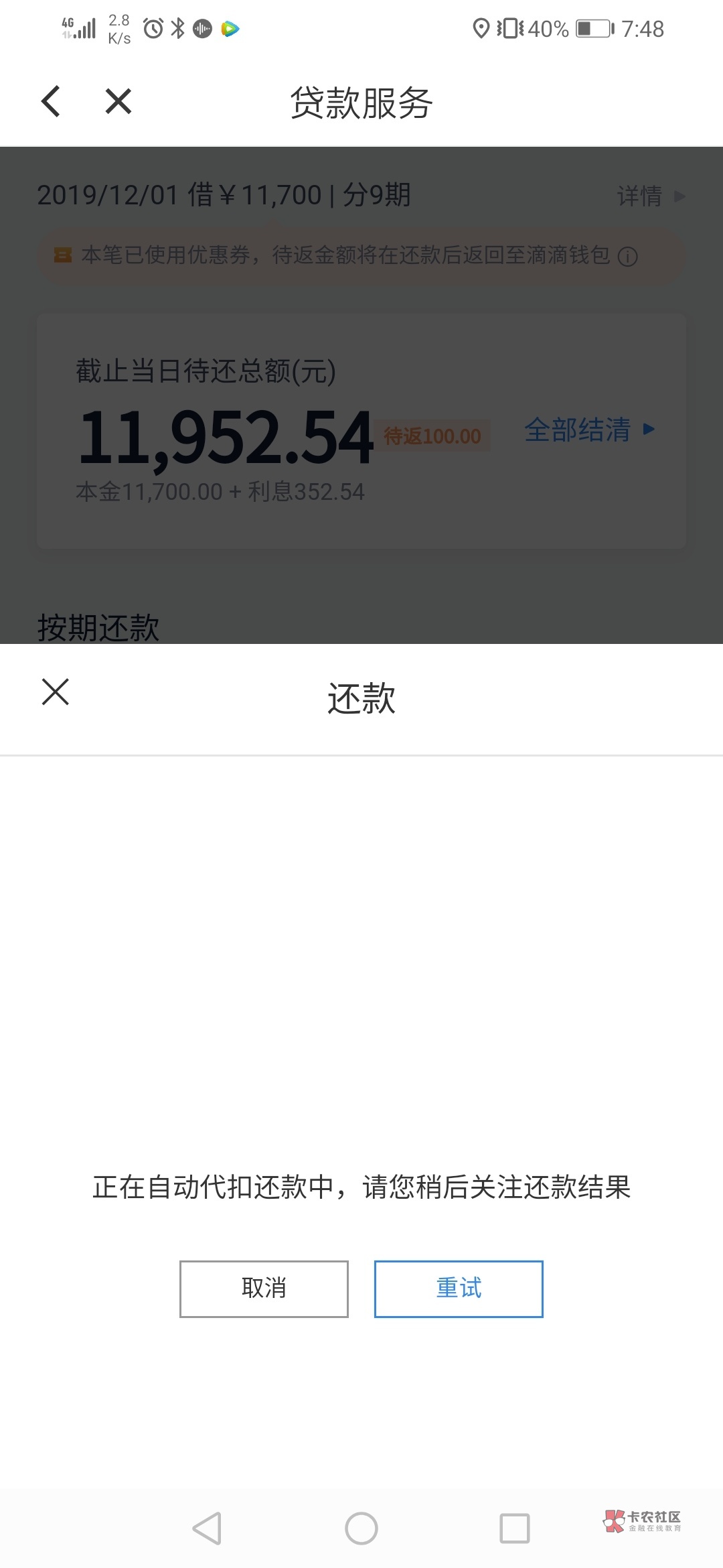 比如滴滴计划十二点扣你的。你就不能主动还。十二点扣款成功了就没啥事。扣款失败了你才能主动还。