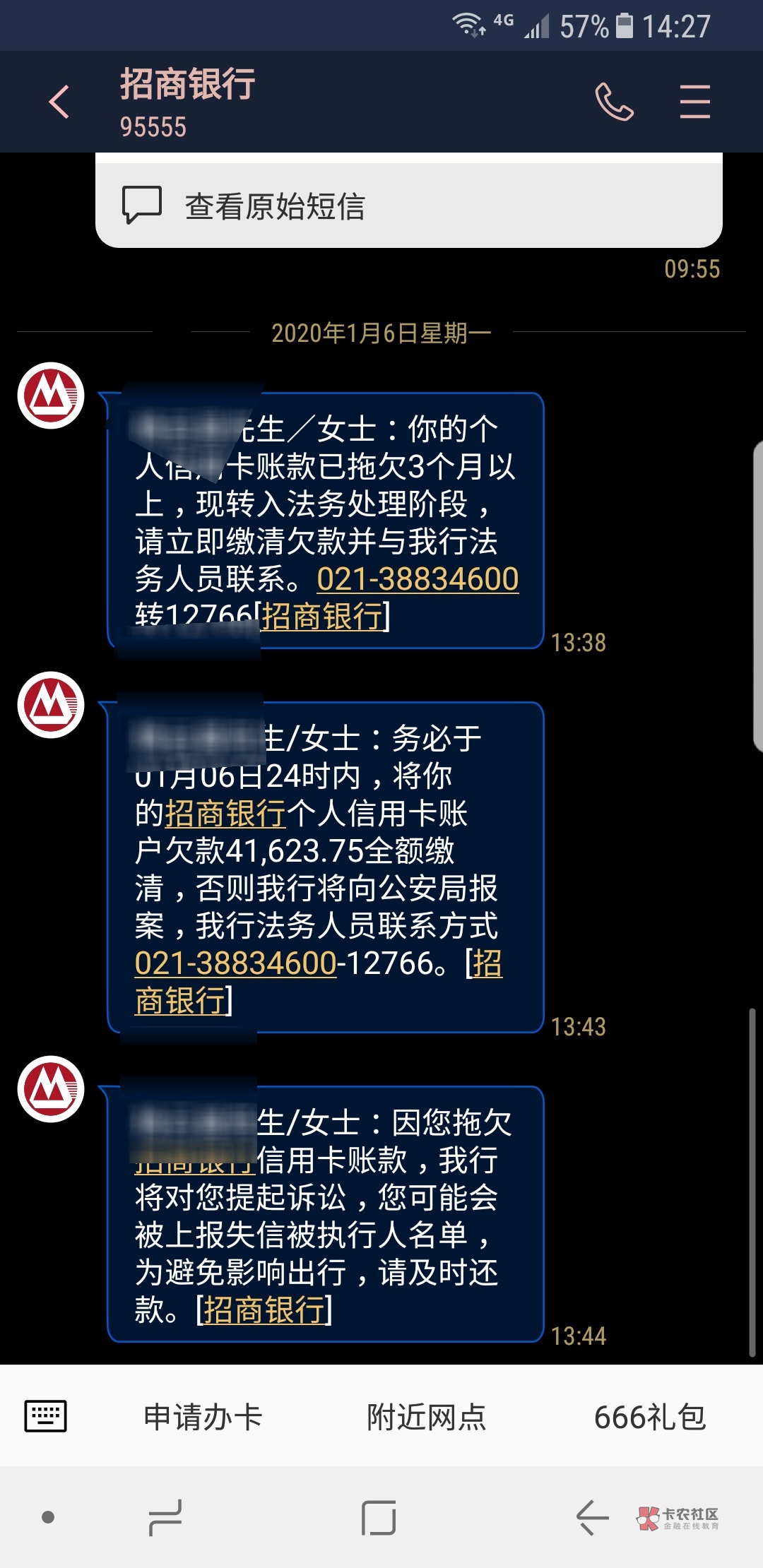 早给我发这个短信了,我Z信都显示呆账了,招商,每个月还50块,起诉去吧。十个月了已经