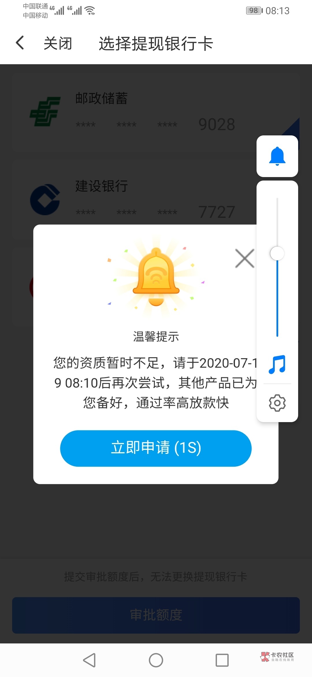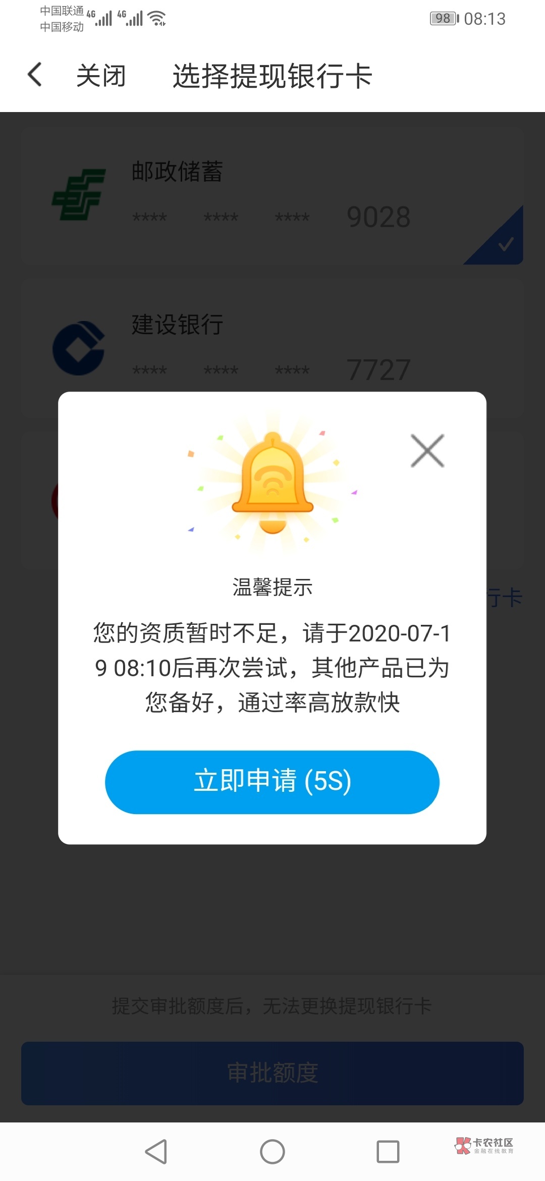 我也是闪银套路2个月 百万12000额度 第一次申请12000秒拒 前几天出黑屋后申请10000 秒过 两个小时到账 然后也想把剩下2000提出来 然后又被秒拒 建议别全额申请