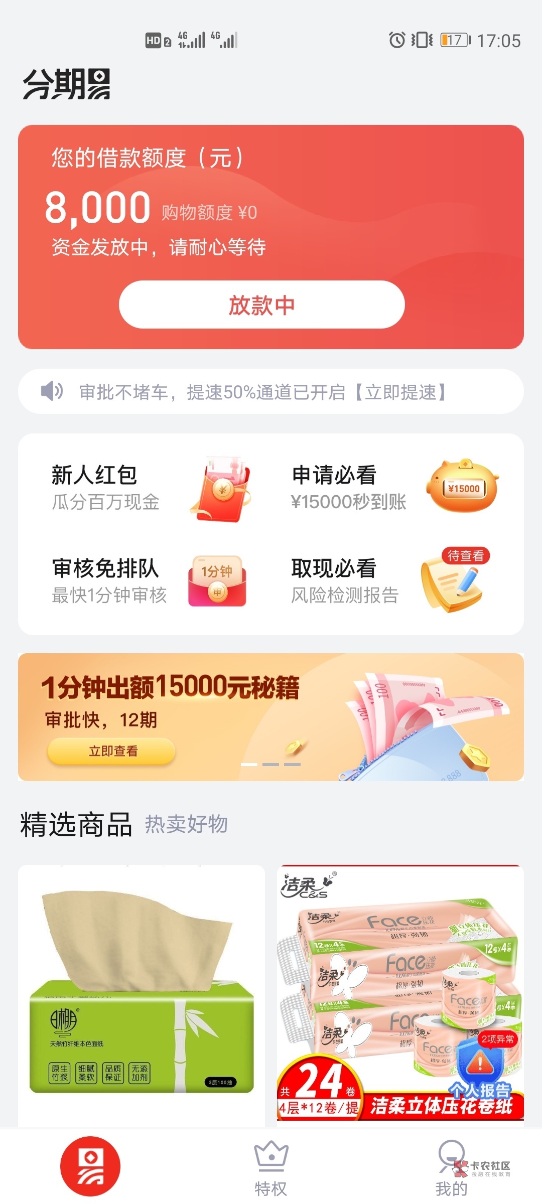 我额度15000,每次点击都是额度审核中,也不给我,也不失败,是没办会员不