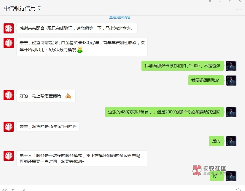 核对完信息了,客服新卡片邮寄地址都确认好了,反正电话都有录音,她说的退2000再扣次年480年费,就不会假了!