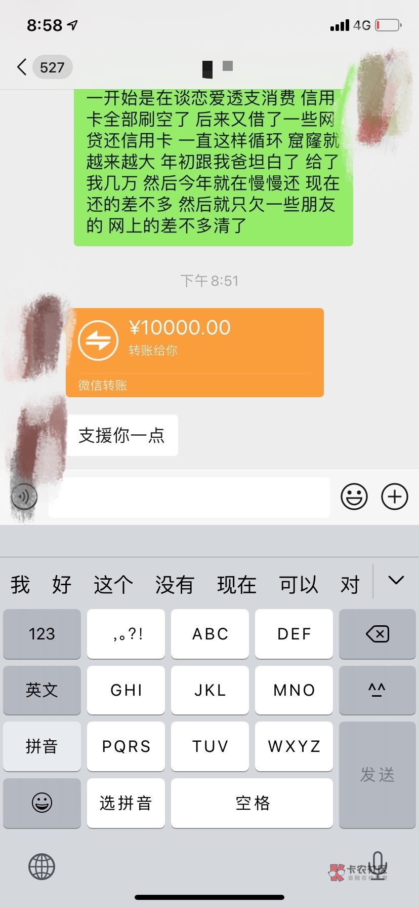 难受什么?你应该感到庆幸,很多人都是借到没朋友,包括我自己,更没有一个借五千转一万过来的,都是借了第一次没还都不会借。而且也不给借很久。很多时候朋友贷比网贷更烦。只要不是拿去送g庄就可以借。以前自己不懂事借去送g庄。现在都是打工资就去玩几百。要么送进去要么下几千。下个月继续,不会再问朋友借钱玩。朋友知道你借钱d别人会怎么想?有多少个不d的愿意跟一个天天d的人一起玩?以前的朋友都没了,现在还好。有三四个朋友,我问他们都借。问过两三次都是还信用卡。让我还网贷等我发财先吧
